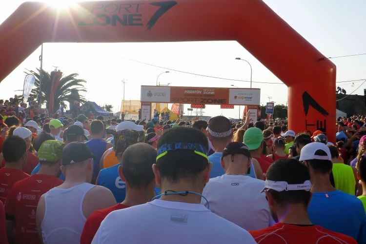 Spanische Lebensart erfahren wir nachts im Hotel: Man hat uns ein ruhiges Zimmer im achten Stock nach hinten raus gegeben. Trotzdem hören wir das Treiben auf den Straßen bis in den frühen Morgen und Heimkehr der Zimmernachbarn bis drei Uhr früh. In Spanien ist man halt im Tagesablauf etwas später dran als in Deutschland. Dies gilt aber nicht für den Marathonstart, der pünktlich um 9:00 Uhr über die Bühne geht. Unser Hotel bietet schon ab 7:00 Uhr ein vorzügliches Frühstück an, und da wir auch ein late check-out bekommen haben, können wir uns für die paar Meter zum Start viel Zeit lassen. Es ist trotz Sonnenaufgang um 8:22 Uhr schon recht warm.