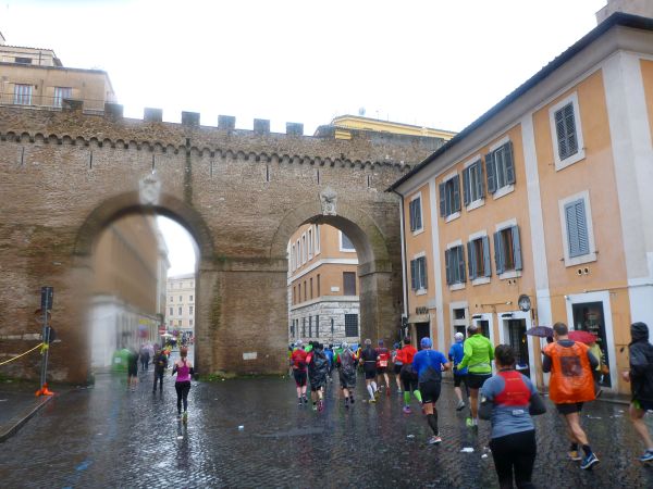 Wir nähern uns einem weiteren Höhepunkt des Marathons. Der Vatikan kommt näher. Wir laufen unter dem Passetto, einem gedeckten Fluchtgang der Päpste zwischen Vatikan und Castel Sant' Angelo, hindurch. Als wir auf die Via della Conciliazione biegen können wir den Petersdom vor uns sehen.