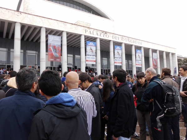 Es geht inzwischen auf Samstagmittag zu, also Zeit die Startunterlagen zu holen. Die gibt es im Palazzo dei Congressi. Der ist für uns am besten mit der U-Bahn zu erreichen, Ausstieg Station EUR Fermi. Von da aus braucht man eigentlich nur noch in die Richtung zu gehen, aus der Leute mit dem roten Rucksack kommen…