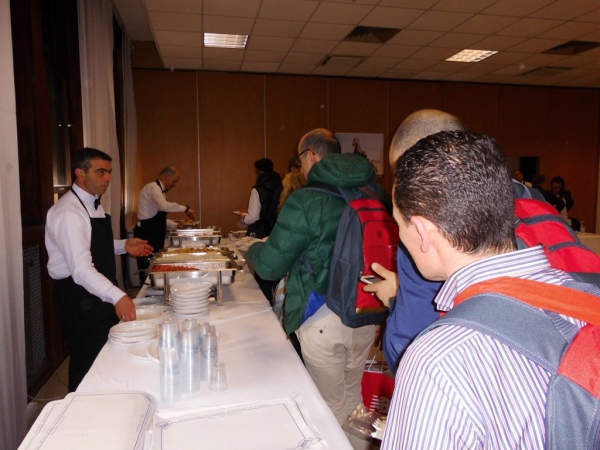 Es folgt die für mich momentan wichtigste Station, die Nudelparty. Ich stehe kurz vor dem Hungertod! Aber 15 – 20 Minuten muss ich noch durchhalten – so lang ist die Schlange, dann erst sind die italienischen Nudeln zum Greifen nah. Aber nicht nur Nudeln werden gereicht, das Angebot ist umfangreicher, ich habe die Qual der Wahl. 6 Euro kostet die Portion. Das habe ich sicher schon billiger gehabt. Aber wenn ich bedenke, das Personal trägt Fliege, wir essen an weiß gedeckten Tischdecken und genießen mediterrane Küche. Das hat schon was!