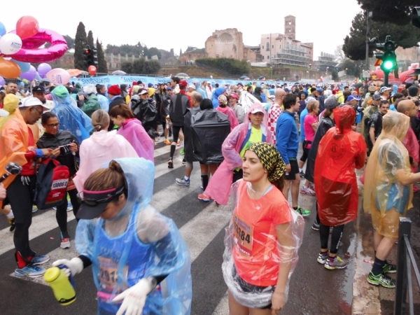 Auf der Startnummer ist der Block vermerkt, in dem jeder Aufstellung zu nehmen hat. Entlang der Via dei Fori Imperiali, zwischen Kolosseum und dem unübersehbaren Monument Vittorio Emanuele II. wird an kleinen Öffnungen zwischen den Absperrgittern der Einlass kontrolliert. Damit sich keiner in einen Block schleicht, der ihm auf Grund seiner angegeben Bestzeit gar nicht zusteht.