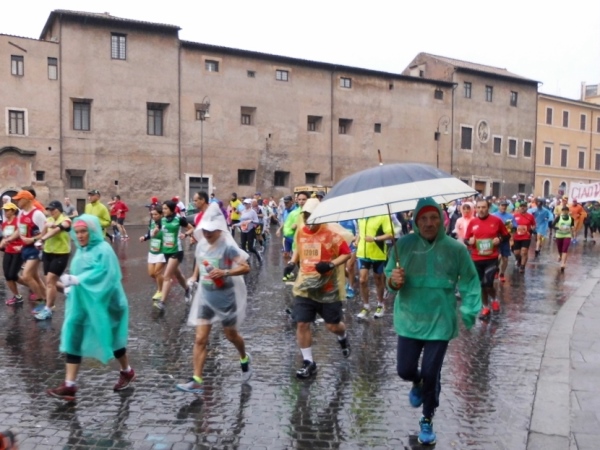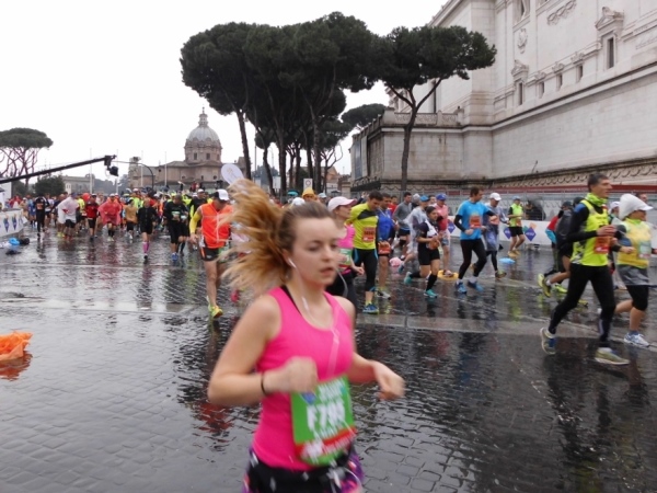 8.50 Uhr soll der Start erfolgen. Diese Zeit ist schon vorbei, als es bei uns da hinten am Kolosseum erst einmal langsam losgeht. Gegen 9 Uhr überqueren wir die Startlinie und sind auch schon auf der Piazza Venezia. Eine Kapelle treibt uns an. Das ist richtig so. Denn, mein Gott: Wer rennt an so einer Fülle von einmaligen Geschichtszeugnissen vorbei, ohne sie zu genießen. Da muss man doch bescheuert sein. Oder Marathonläufer. Oder beides…