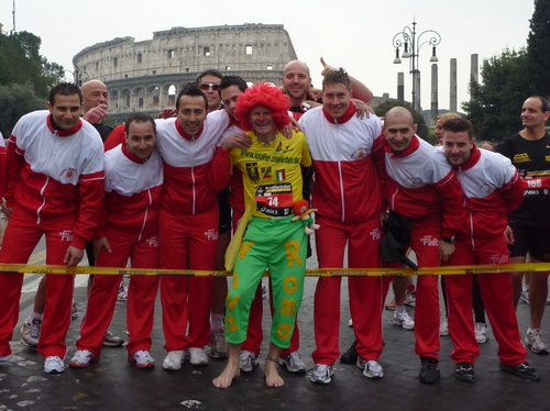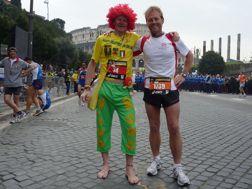 Mindestens fünfzig Läufer wollen es am Sonntag Abebe Bikila gleichtun und den Marathon barfuss laufen. Unter ihnen auch „unser Pumuckl“, dessen Taten sich bis nach Rom herumgesprochen haben. Im traditionellen Kostüm wird er der Presse präsentiert und im Nu von Kameras, Mikrofonen und Fotoapparaten umringt. Warum er das macht, ob das nicht weh tut usw. Inzwischen ist der Dietmar („Zivil ist meine Verkleidung, nicht das Kostüm“) mindestens so routiniert wie die Stars. Die Sympathien der anwesenden Journalisten sind ihm sicher. Und am Sonntag wird er die Herzen der Römer (und Römerinnen!) erobern.