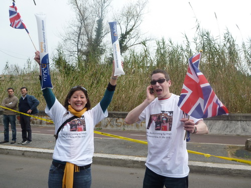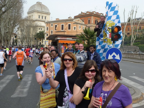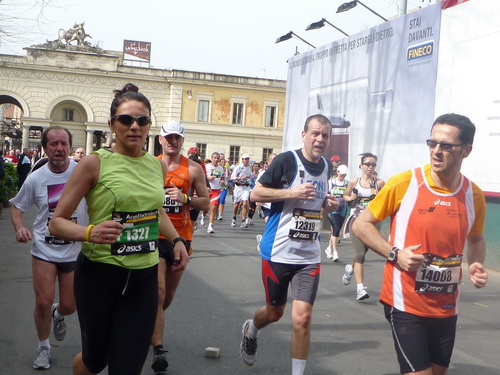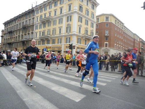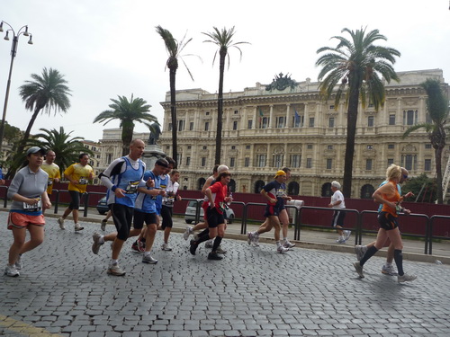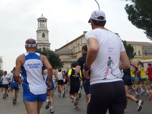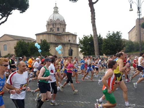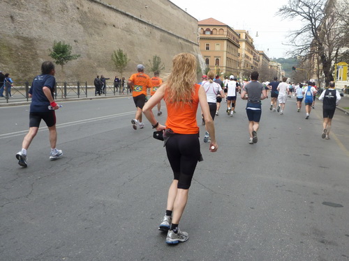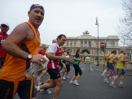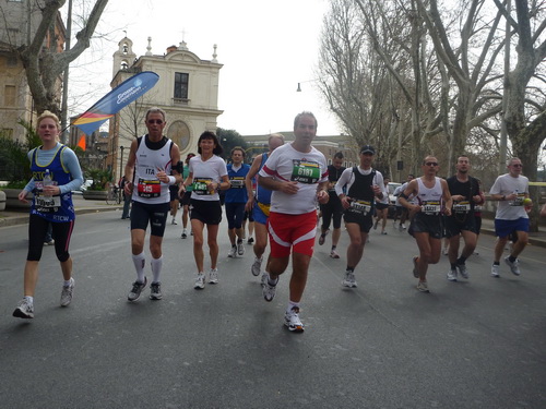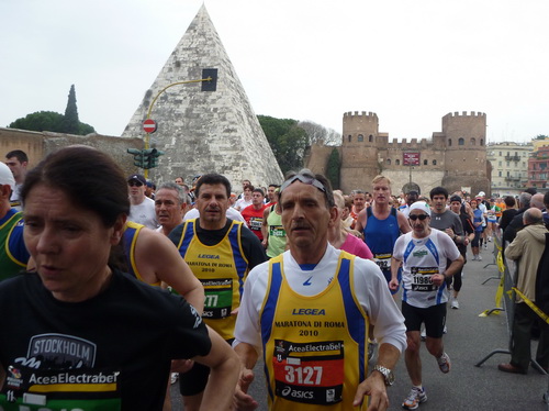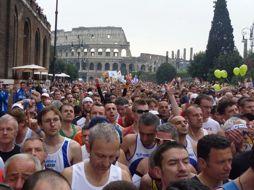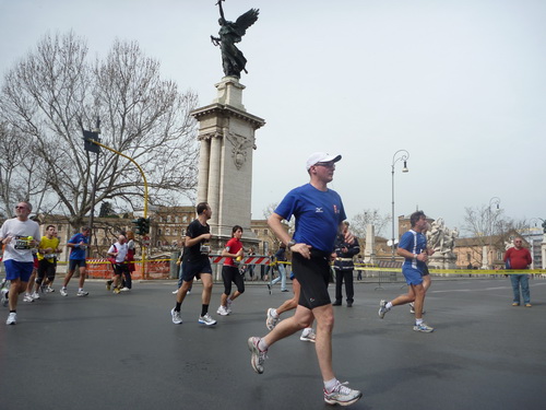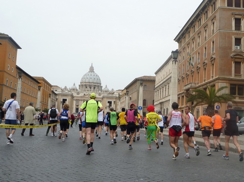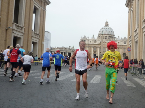 Wenn man nämlich wenig später aus einer relativ schmucklosen Straße rechts in die Via della Conciliazione einbiegt und plötzlich den Petersdom vor sich sieht, bleibt einem unweigerlich für einen kurzen Moment die Luft weg. Das Bild auf der Titelseite unserer Terminliste 2010 ist genau hier aufgenommen. Musik spielt, viele Zuschauer stehen an der Straße und auf dem Platz. Man möchte bleiben, aber 25 km sind noch zu laufen.