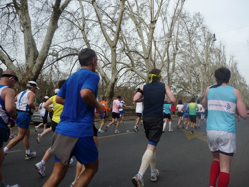 An den Säulen des Petersplatzes und später an den Mauern des Vatikans entlang geht es weiter. Kurz bevor die Halbdistanz erreicht wird, sind wir am Tiber. Rechts erkennt man das Olympiastadion, das für die Fußball-WM 1990 umgebaut wurde. Die folgenden, mit den Olympischen Ringen geschmückten Gebäude sind noch so wie zu den Olympischen Spielen 1960. Spätestens jetzt holen uns deren Geschichten wieder ein. Abebe Bikalas sowieso, aber auch an Armin Hary muss ich denken, der Gold über 100 m und in der 4 x 100 m Staffel gewann, an Carl Kaufmann, der Silber über 400 m holte und an den Italiener Livio Berutti, der mit seinem Weltrekord und seiner Goldmedaille über 200 m zum Helden wurde.