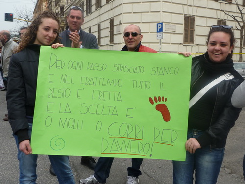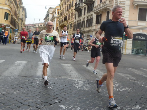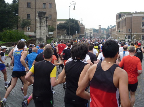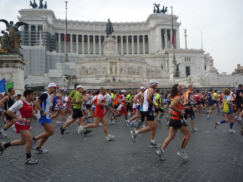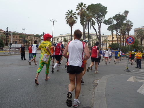 Die vielen Zuschauer sind sowieso ganz aus dem Häuschen. Und als sie Dietmar entdecken und dass er barfuß läuft, legen sie noch eine Schippe drauf. Das kann ja heiter werden. Vom Palazzo, den die Römer nicht so mögen (sie behaupten, von ganz oben habe man die beste Aussicht über die Stadt – weil man den Protzpalast dann nicht sieht), geht es mit Musik eine kurze Steigung hoch, dann leicht abwärts zum Circo Massimo, jener gigantischen Arena, die fast 400.000 Zuschauern fasste. „Ben Hur“ und das legendäre Wagenrennen fällt mir ein. Fotos kann ich keine machen, ich bin auf der falschen Seite und ein Wechsel ist bei dem Verkehr nicht möglich. Ich hole es am Ende des Laufes nach. Dann kommen wir hier noch einmal vorbei.