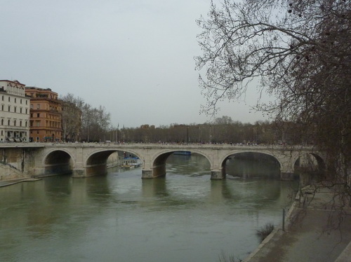 Der Prachtblick links auf die Engelsburg (km 15) veranlasst mich immer wieder zu einem Fotostopp. Ursprünglich war die Burg ja als Mausoleum für Kaiser Hadrian und seine Nachfolger gedacht. Erst später machten verschiedene Päpste daraus eine Festung. Über die Ponte Cavour wird der Tiber gequert. Trotz des kalten Windes sind auch auf der Brücke etliche Zuschauer. Durch Häuserschluchten erreichen wir die Piazza Cavour (km 16) und ich bereite Dietmar und Otto auf einen der schönsten Momente des ganzen Laufes vor.