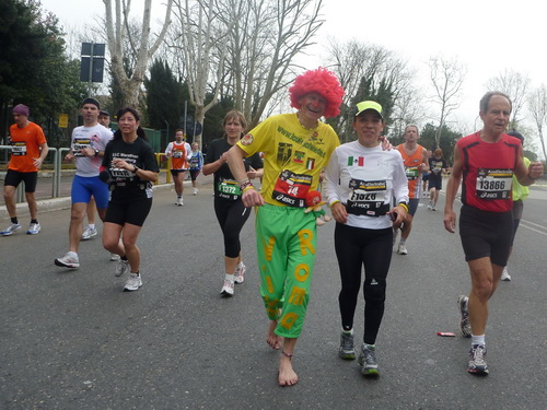 Die nächsten Kilometer führen durch typische Wohngebiete ohne besondere optische Reize.Spannend und richtig laut wird es wieder, als wir kilometerweit entlang des Tiber laufen. Natürlich fällt Dietmar mit seiner roten Perücke überall sofort auf. Ich kann beobachten, wie die Leute entzückt auf ihn zeigen, sich über seine Verkleidung freuen und entsetzt aufschreien, wenn ihr Blick endlich seine nackten Füße erreicht hat. „Der Pumuckl in Rom, ich glaub es nicht.“ Aus Regensburg kommen die Läuferinnen, die den Spaßläufer natürlich kennen. Für die Römer ist er ein Clown. „Aber das ist nächstes Jahr anders“, hofft er zumindest.