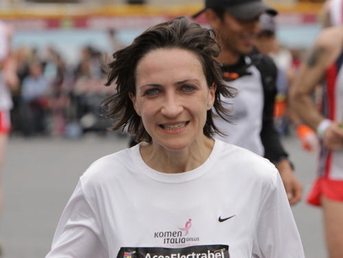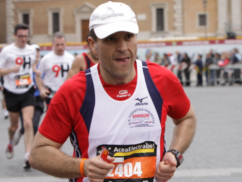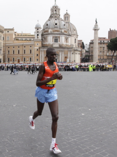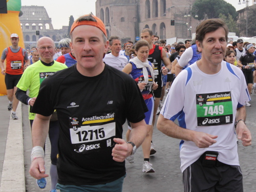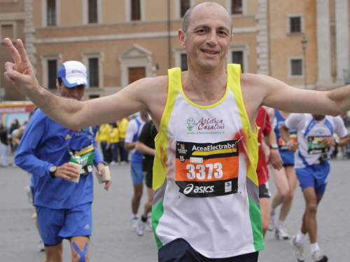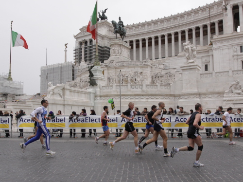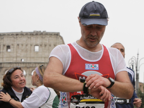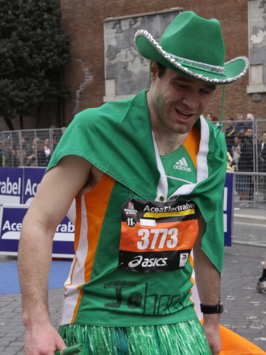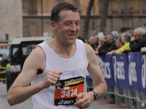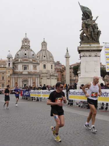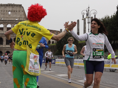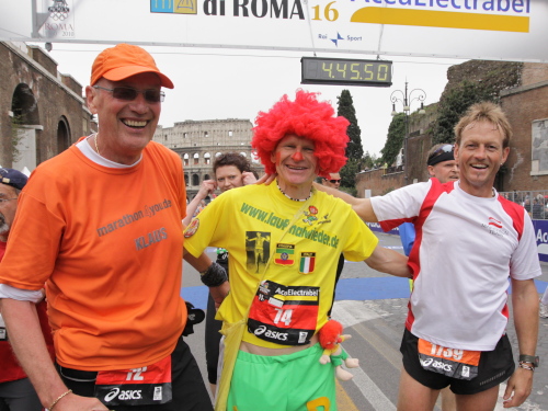 Dann müssen wir die Arena fast komplett umrunden, bevor auch wir dann auf der Via die Fori Imperiali ins Ziel laufen. Viele Zuschauer sind auch hier nicht, es ist kaum Platz. Und dennoch ist es für mich das schönste Finish. Dietmar wird gleich einkassiert und interviewt. Ich glaube mal, er hat recht und die Römer wissen jetzt tatsächlich, wer und was der Pumuckl ist. Dabei kommt seine große Show erst noch. Er geht zurück, applaudiert den Läuferinnen und Läufern, klatscht sie ab, macht die Welle und wenn es sein muss, begleitet er sie ins Ziel. Das macht er bis ganz zum Schluss. Die Marathonis freut's.