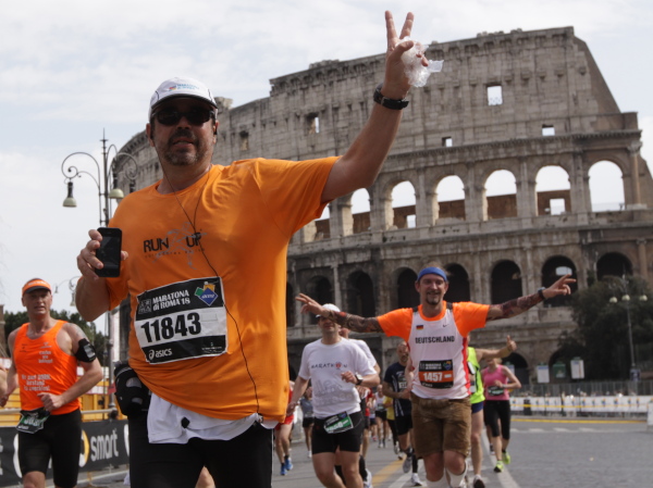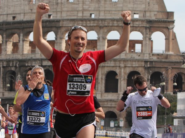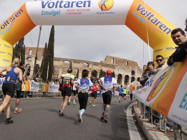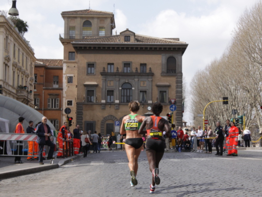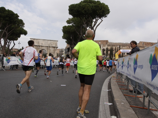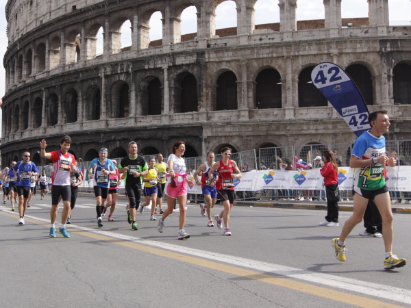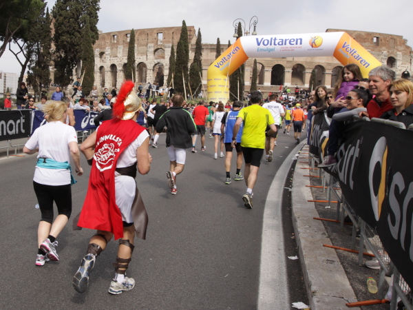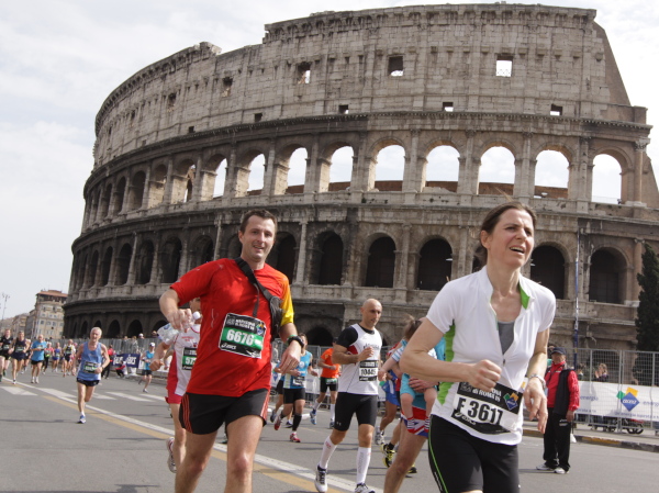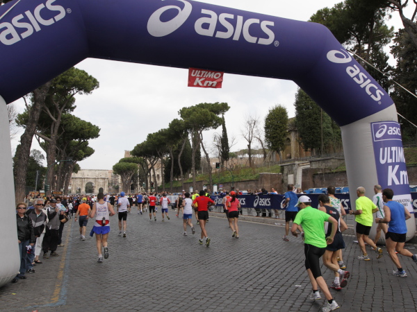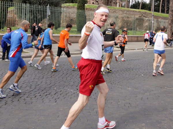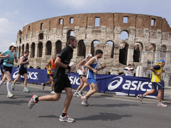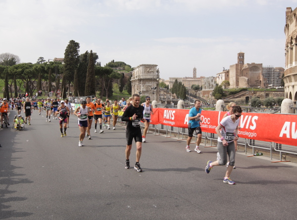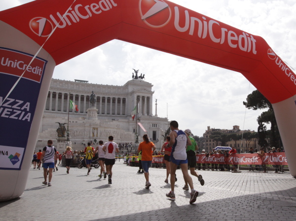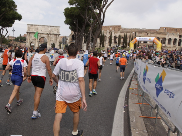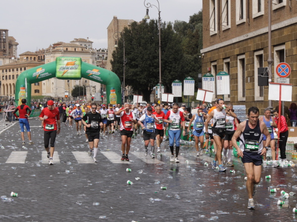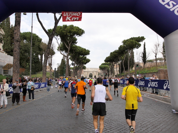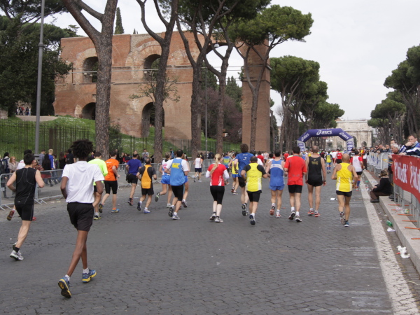 Dann ist die Piazza Venezia mit dem Palazzo wieder in Sicht. Die Steigungen der gepflasterten Straße nimmt man nun doch deutlich wahr, allerdings auch das dazwischen liegende Gefälle. Das deutlich ausgedünnte Läuferfeld erlaubt nun schon eher einen Blick auf den Circo Massimo. Aber wie schon gesagt, viel zu sehen gibt es nicht. Die letzte Verpflegungsstelle wird noch einmal ausgiebig genutzt, denn gleich werden die letzten Kräfte gefordert. Die Straße entlang des Foro Romano in Richtung Kolosseum lief Abebe Bikila 1960 in der Gewissheit, das Rennen zu gewinnen. Beim Konstantinbogen war er am Ziel seiner Träume.