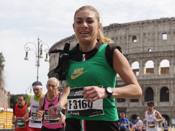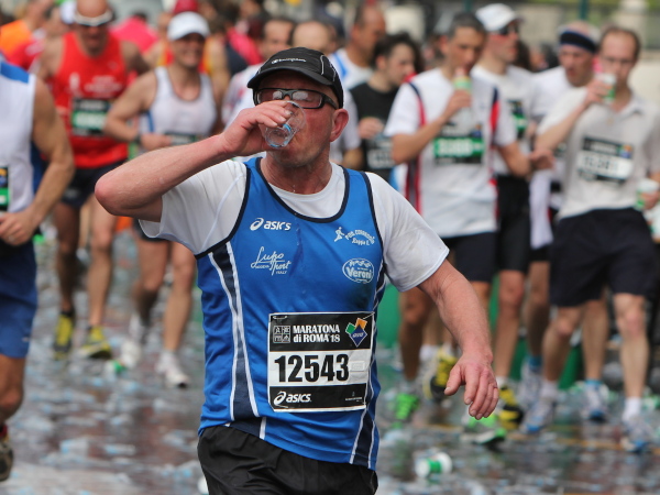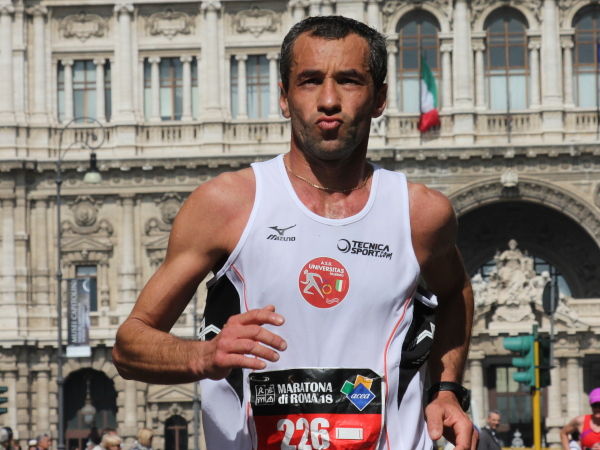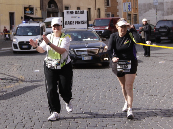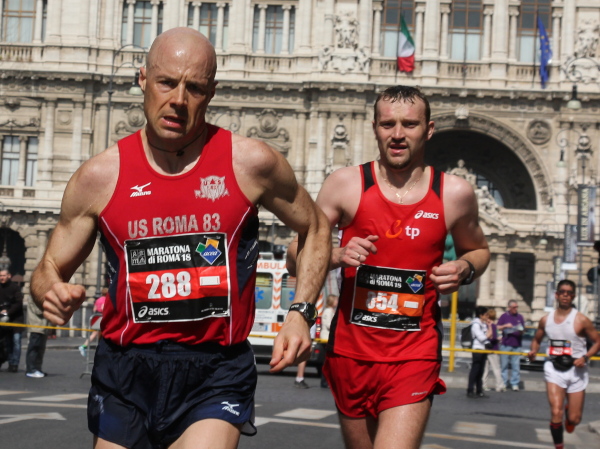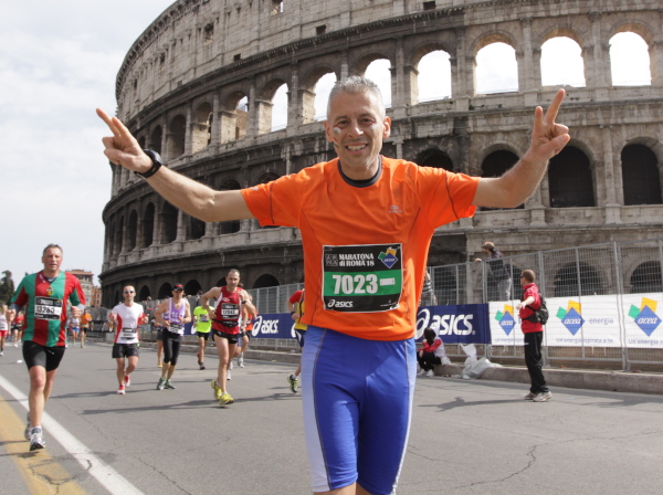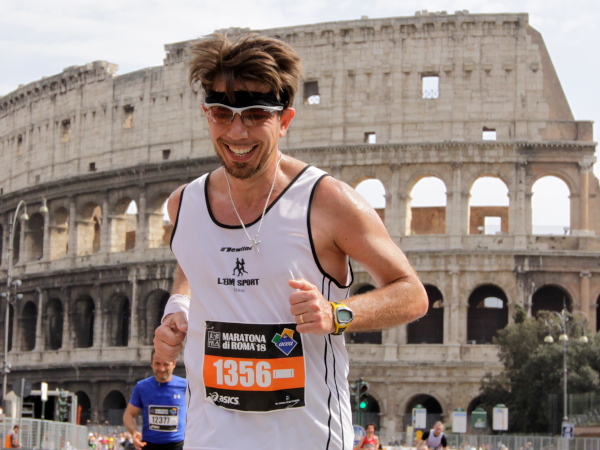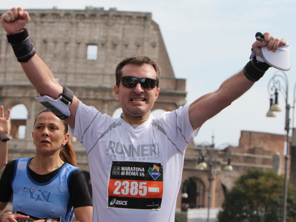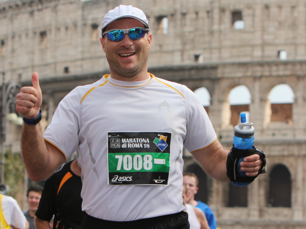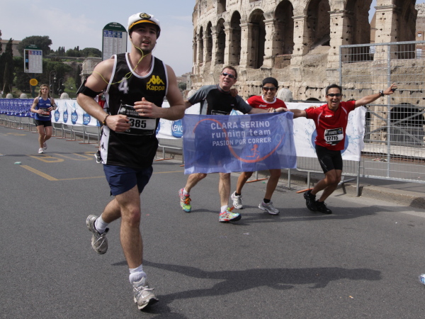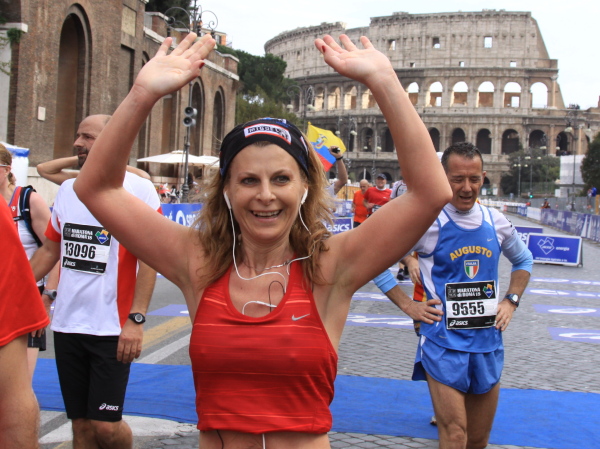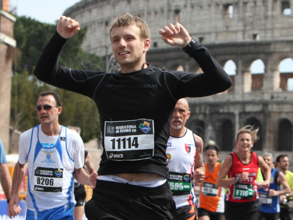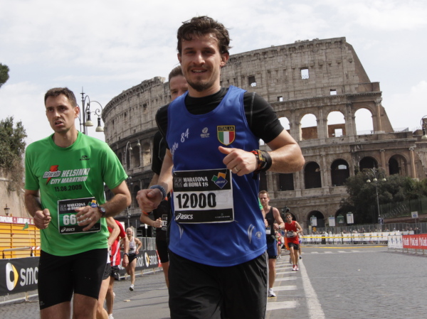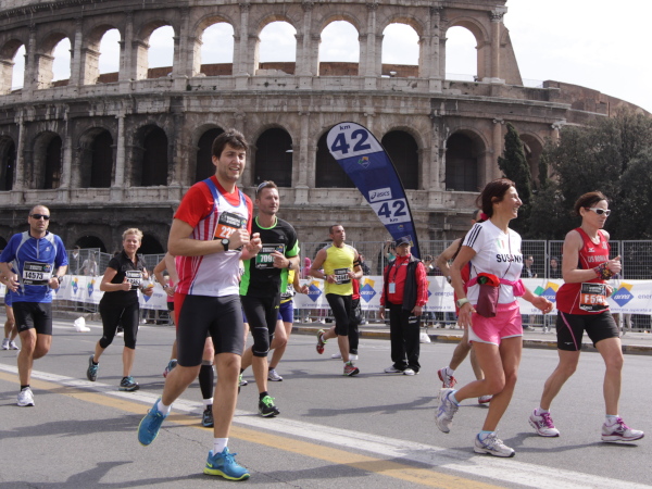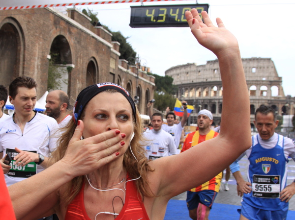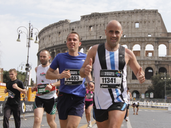 Dann ist die Piazza Venezia mit dem Palazzo wieder in Sicht. Die Steigungen der gepflasterten Straße nimmt man nun doch deutlich wahr, allerdings auch das dazwischen liegende Gefälle. Das deutlich ausgedünnte Läuferfeld erlaubt nun schon eher einen Blick auf den Circo Massimo. Aber wie schon gesagt, viel zu sehen gibt es nicht. Die letzte Verpflegungsstelle wird noch einmal ausgiebig genutzt, denn gleich werden die letzten Kräfte gefordert. Die Straße entlang des Foro Romano in Richtung Kolosseum lief Abebe Bikila 1960 in der Gewissheit, das Rennen zu gewinnen. Beim Konstantinbogen war er am Ziel seiner Träume.