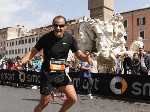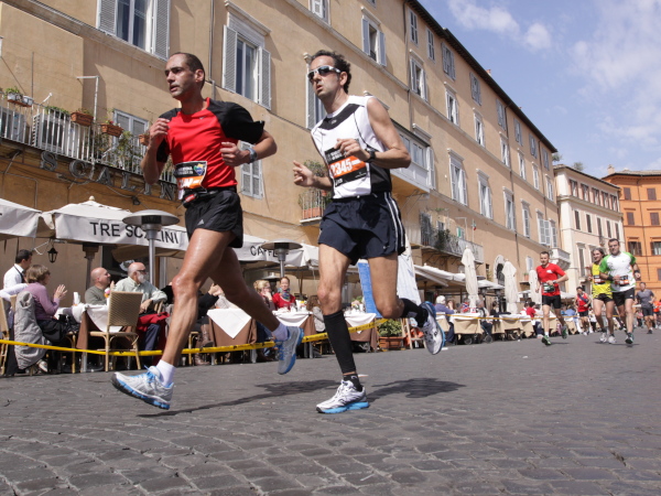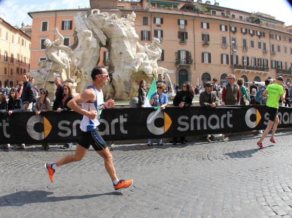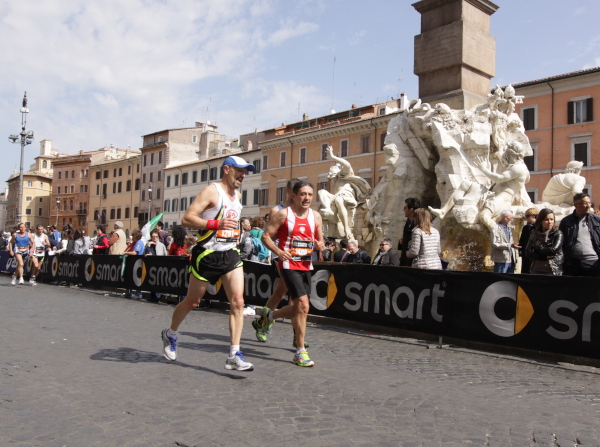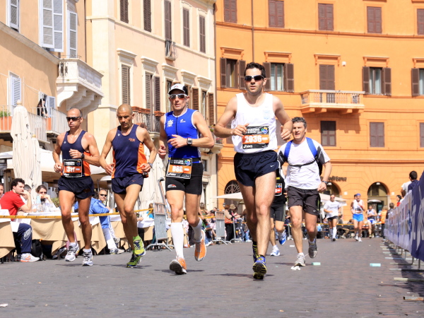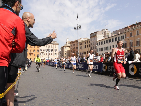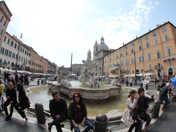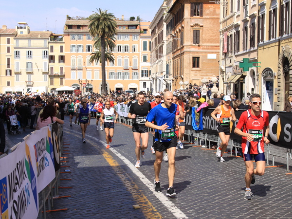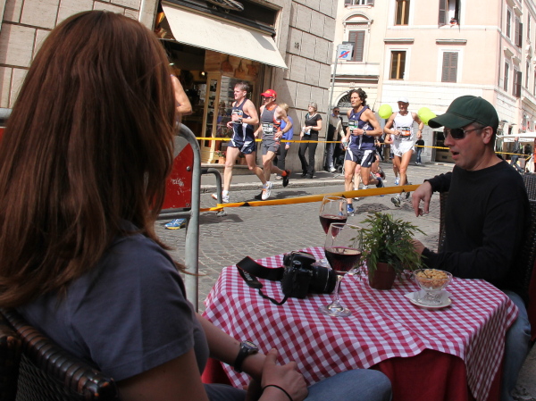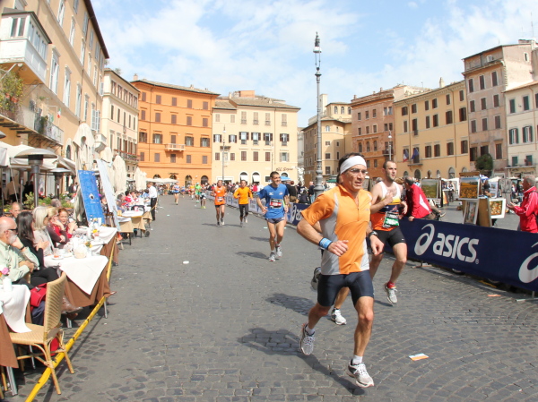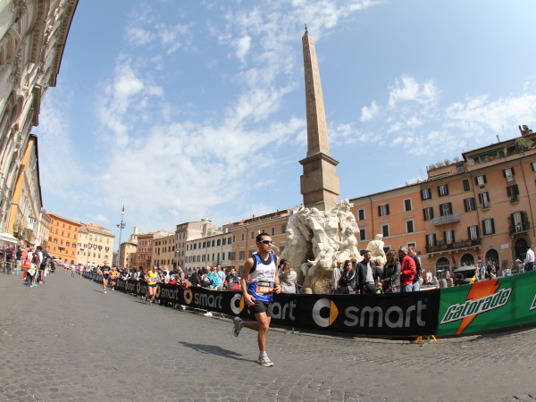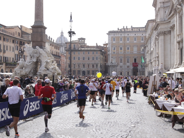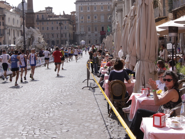 Genau dann, wenn der Marathon so richtig schwer wird, auf den letzten 10 Kilometern also, erlebt man die Italiener, wie man sie kennt: Laut und temperamentvoll und das tausendfach. Und es sind durchaus nicht nur Touris und Shopper, die die Straßen bevölkern. Noch nie habe ich mehr Zuschauer in Rom erlebt und noch nie eine solche Stimmung wie heute. Auf der Piazza Navona geht es los. Wie man noch heute an den Umrissen und der Anordnung der Paläste und Kirchen erkennen kann, war auch hier einmal eine Arena. Der Platz um den Vierflüßebrunnen von Bernini ist das ganze Jahr über Treffpunkt von Jung und Alt. Unzählige Maler stellen ihre Bilder aus, Musiker und Akrobaten zeigen ihre Kunst. Und in den Cafés und Bars genießt man den Espresso und das beste Eis Italiens. Viele Szenen des legendären Films „La Dolce Vita“ wurden hier gedreht. Italien wie im Bilderbuch.