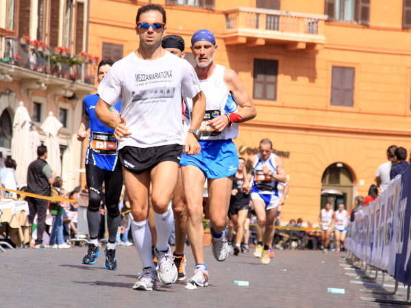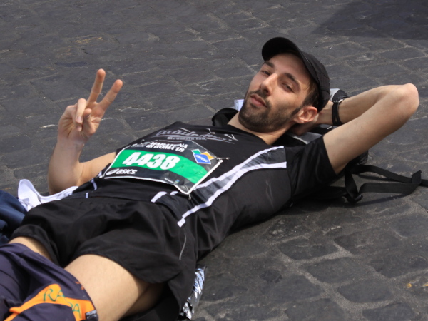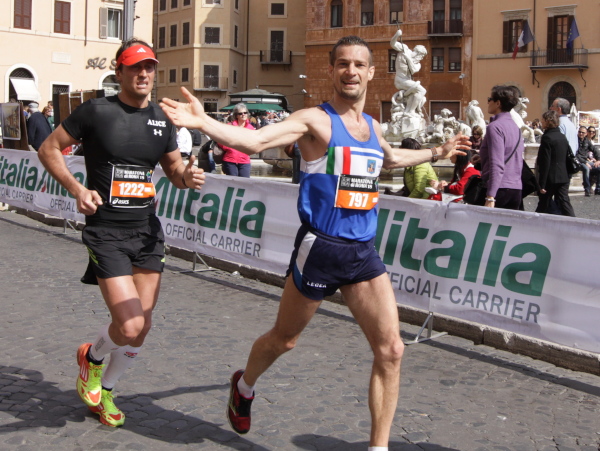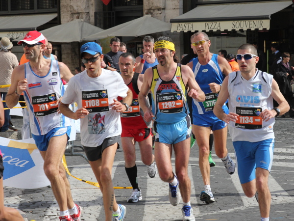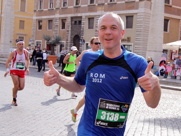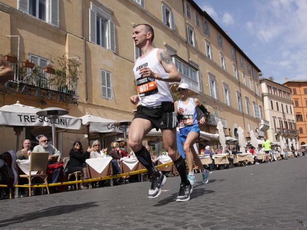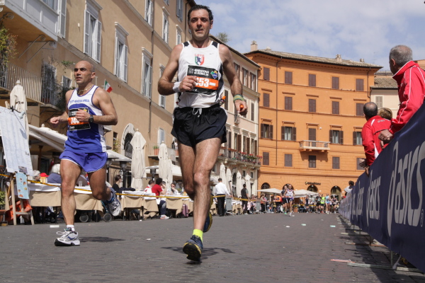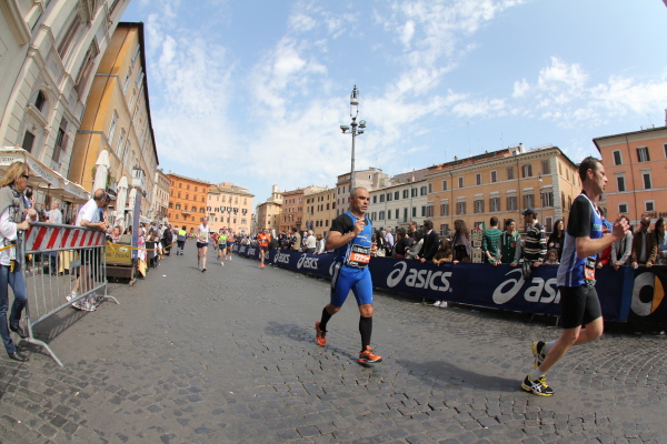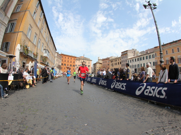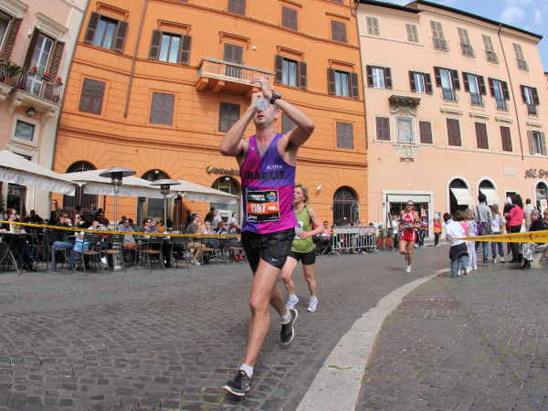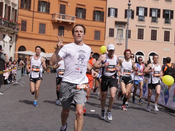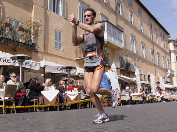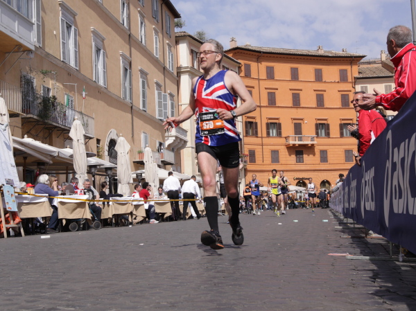 Genau dann, wenn der Marathon so richtig schwer wird, auf den letzten 10 Kilometern also, erlebt man die Italiener, wie man sie kennt: Laut und temperamentvoll und das tausendfach. Und es sind durchaus nicht nur Touris und Shopper, die die Straßen bevölkern. Noch nie habe ich mehr Zuschauer in Rom erlebt und noch nie eine solche Stimmung wie heute. Auf der Piazza Navona geht es los. Wie man noch heute an den Umrissen und der Anordnung der Paläste und Kirchen erkennen kann, war auch hier einmal eine Arena. Der Platz um den Vierflüßebrunnen von Bernini ist das ganze Jahr über Treffpunkt von Jung und Alt. Unzählige Maler stellen ihre Bilder aus, Musiker und Akrobaten zeigen ihre Kunst. Und in den Cafés und Bars genießt man den Espresso und das beste Eis Italiens. Viele Szenen des legendären Films „La Dolce Vita“ wurden hier gedreht. Italien wie im Bilderbuch.