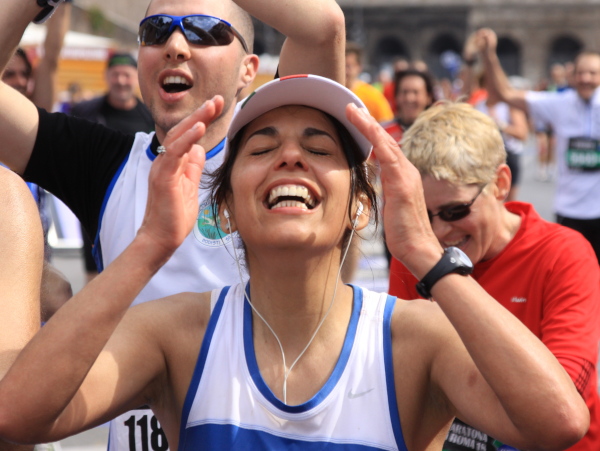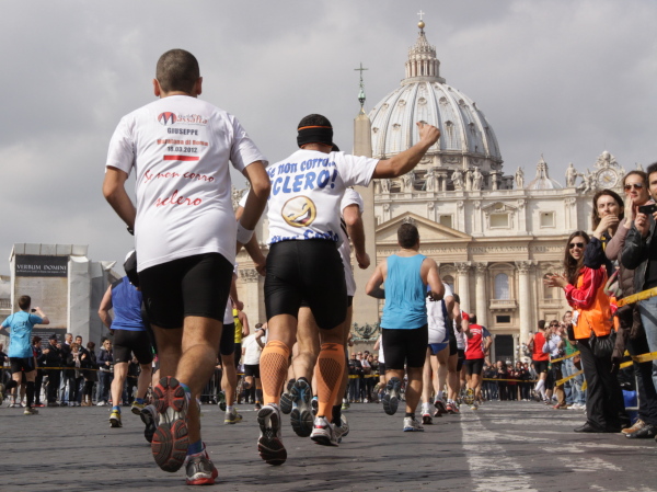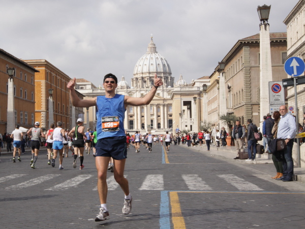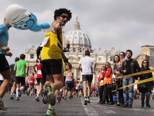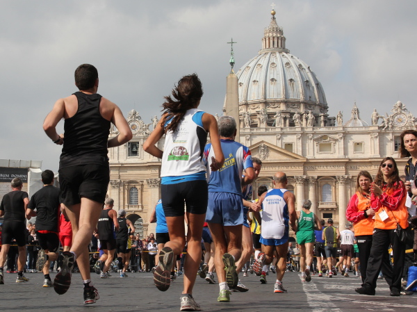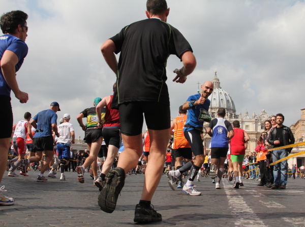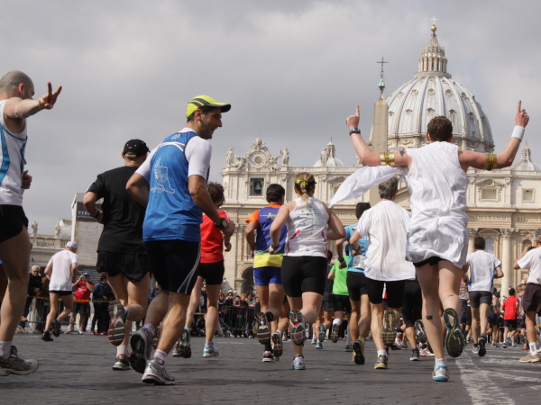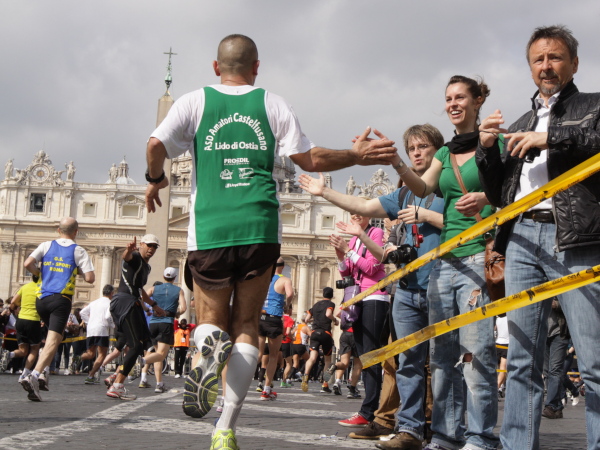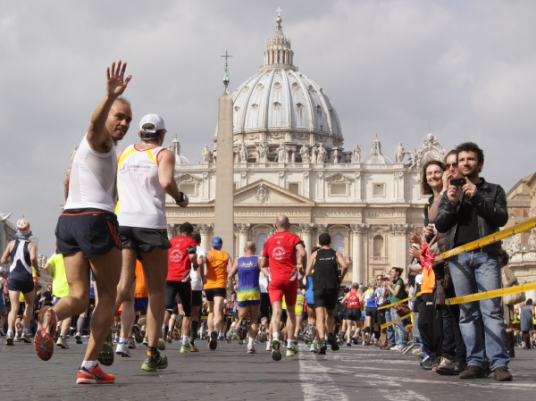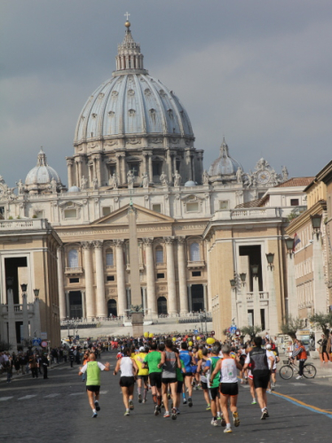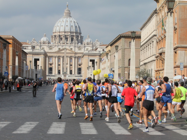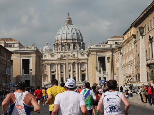 Der Höhepunkt des Marathons in Rom kündigt sich ganz unspektakulär an. Die Straßen sind gepflastert oder schlecht asphaltiert, die Häuser meist schmucklose Wohnblocks, ehe man rechts in die Via della Conciliazone einbiegt und das Bild des Petersdoms (km 17) so vor sich hat, wie man es aus dem Fernsehen kennt. „Grande Momento“, stöhnt da der Italiener und nicht wenige wischen sich Tränen aus den Augen. Es ist gigantisch. Der Marathon in Rom ist gelaufen. Jetzt kann nichts mehr passieren. Nichts, was diesen Moment übertrifft. Jede Menge Zuschauer bejubeln die Marathonis, Musik spielt. Keiner wird diesen kurzen Streckenabschnitt jemals vergessen. Wie muss das beim Marathon am Neujahrstag 2000 gewesen sein? Start war einmalig hier auf dem Petersplatz, Papst Johannes Paul II. erteilte den Läuferinnen und Läufern den Segen.