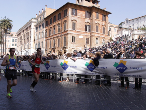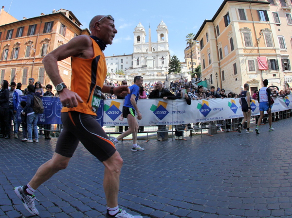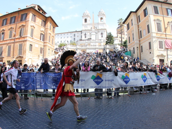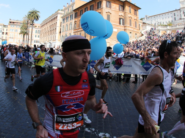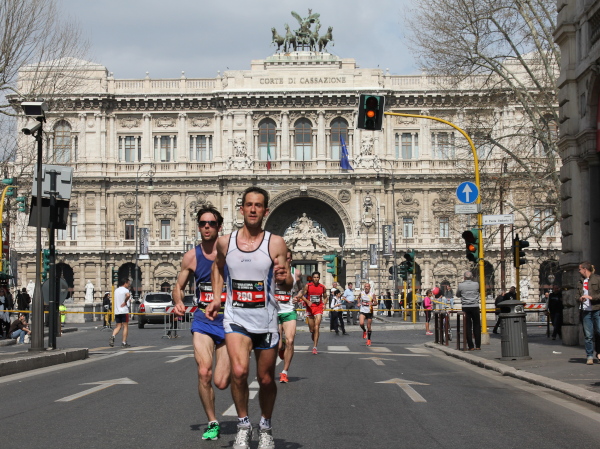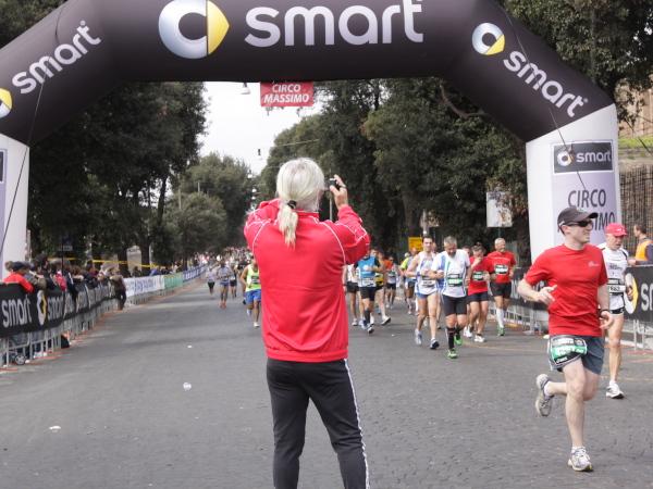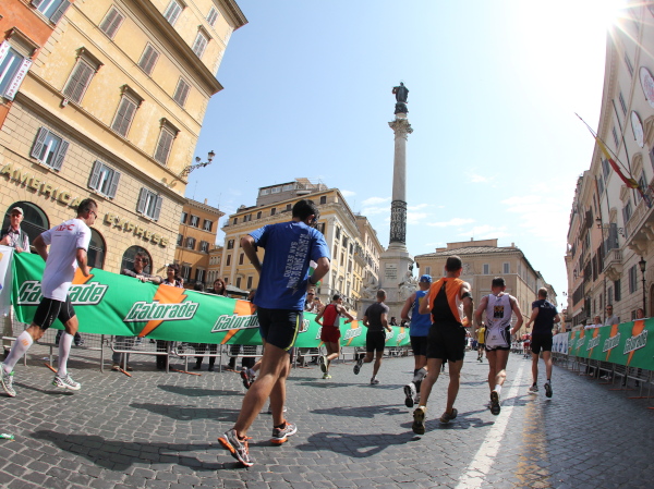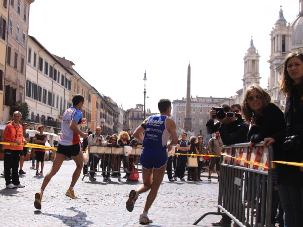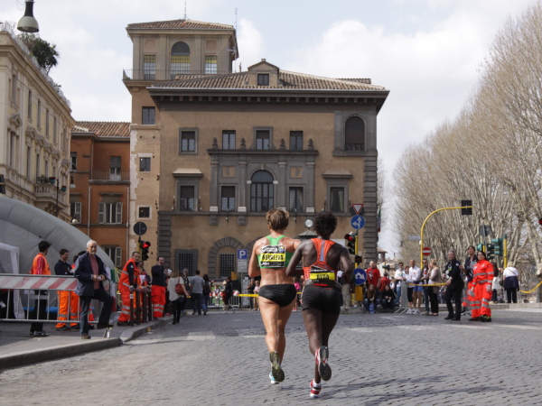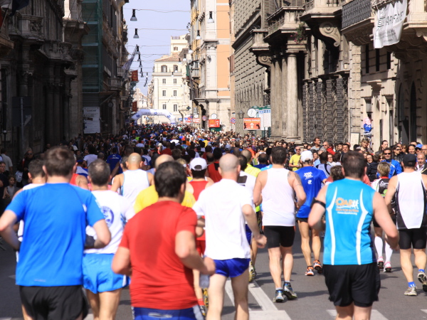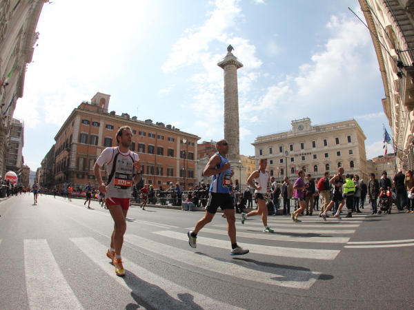 Jetzt läuft man auf die Piazza Venezia zu und blickt auf eine unübersehbare Menschenmenge. Ein 5 Kilometer langes Schaulaufen steht auf dem Programm, ehe man einen Steinwurf weiter wieder auf die Piazza kommt, um die letzten ca. 3 km in Angriff zu nehmen.
