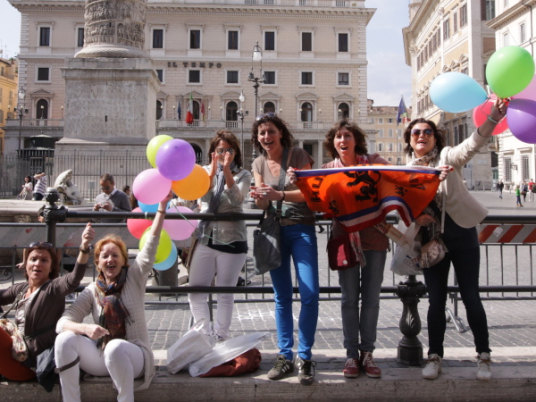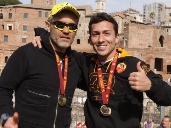 Zunächst geht es schnurgerade auf der Via del Corso, einer der großen Einkaufsstraßen Roms, in Richtung der Piazza dei Popolo mit dem riesigen Obelisken, den Kaiser Augustus von Ägypten nach Rom schaffen ließ. Ursprünglich hatte er seinen Platz im Circus Maximus. Dann die Spanische Treppe, so genannt wegen der Spanischen Gesandtschaft beim Heiligen Stuhl, die sich seit dem 17. Jahrhundert gleich gegenüber befindet. Auf den 135 Stufen sitzen Touris, Fans und eine Blaskapelle wie auf einer Tribüne. An der 1854 errichteten Mariensäule vorbei geht es in eine schmale, schattige Gasse, die direkt zum Trevibrunnen, Roms berühmtesten und größten Brunnen, führt. Auch hier sorgen viele Zuschauer und Passanten für eine tolle Atmosphäre und für eine manchmal beängstigende Enge.