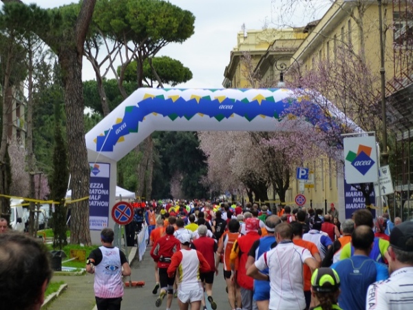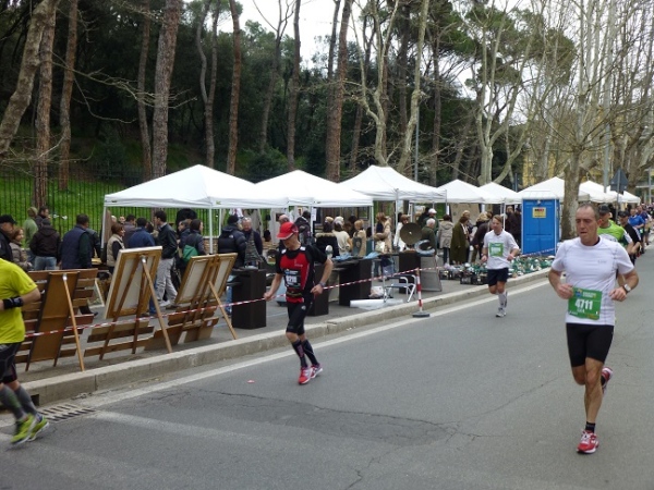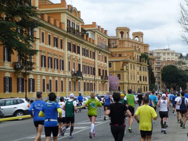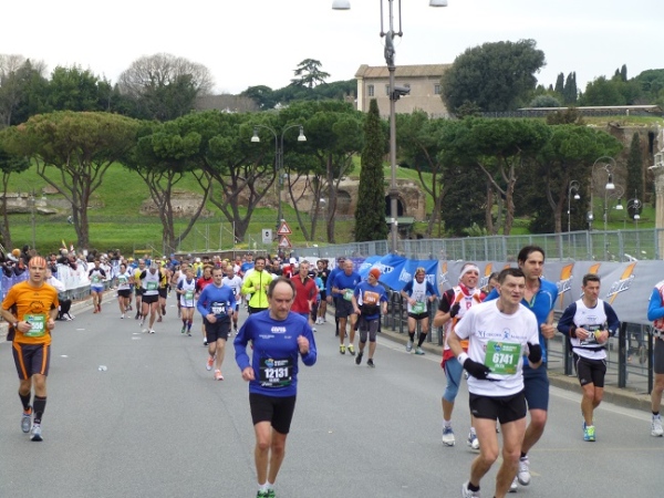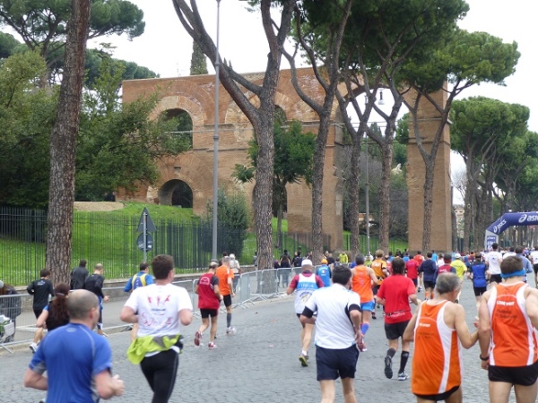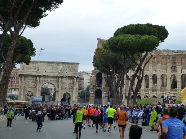 Die Schlussschleife bringt nicht viel Neues, aber das Altbekannte ist vom Feinsten. Vittoriale, Kapitolshügel, Marcellustehater, Circus Maximus heißen abermals die Stationen. Dann setzen wir links abzweigend die Umkreisung des Palatin-Hügels fort. Wunderschön ist der Schlusskilometer über die piniengesäumte Via di San Grigorio. Die LKWs, die sich hier vor dem Lauf zur Gepäckabgabe aneinander reihten, sind bereits in den Zielbereich verlegt und so haben wir freien Blick und Auslauf. Am Ende des Pinientunnels grüßt schon der Konstantinsbogen.