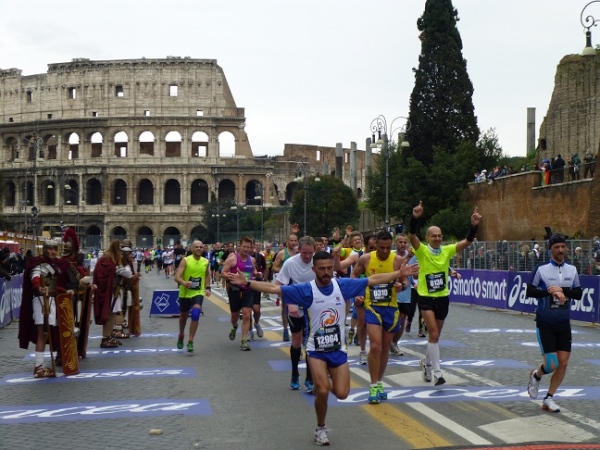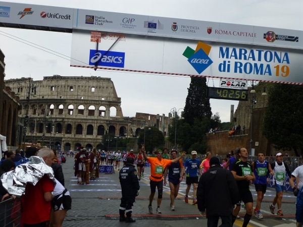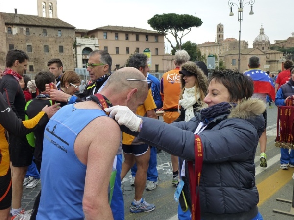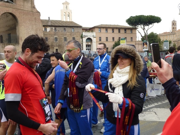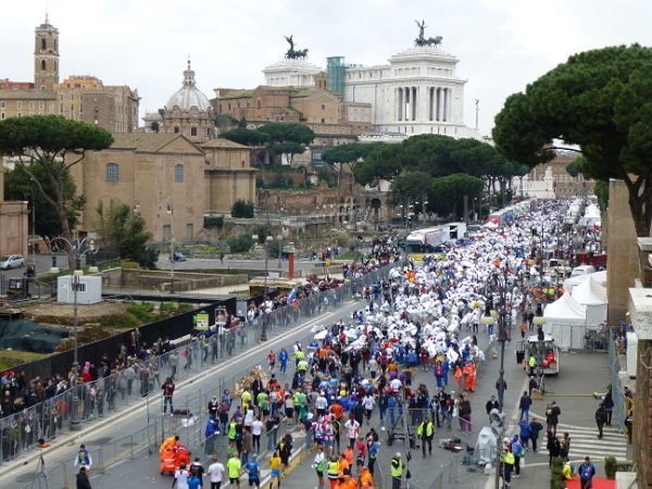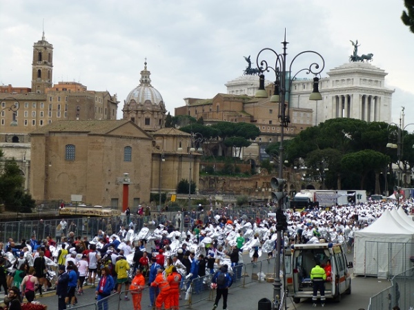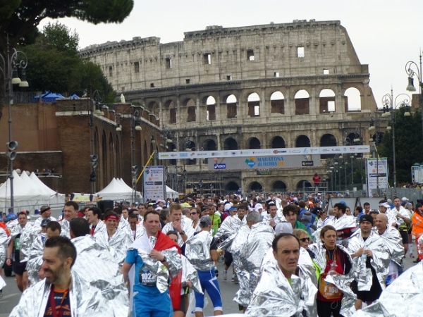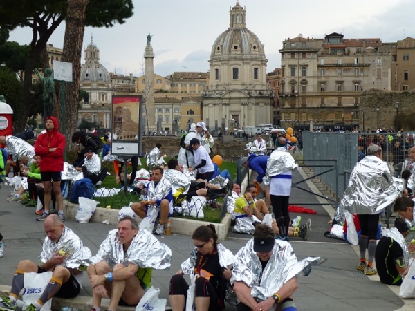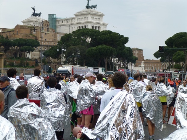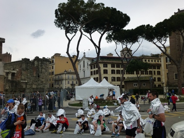 Vielleicht bilde ich es mir nur ein: Aber mehr als sonst sehe ich die Finisher in Triumphpose über die Via dei Fori Imperiali, vorbei an einer Garde stoisch der Kälte trotzender Legionäre, ins Ziel einlaufen. Medaillen- und wärmefolienbehängt lasse ich die grandiose Szenerie des Start- und Zielbereichs nochmals auf mich wirken.