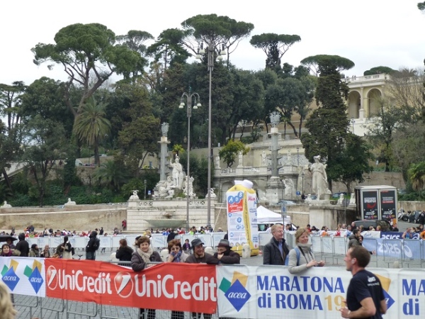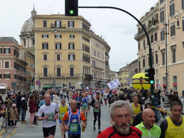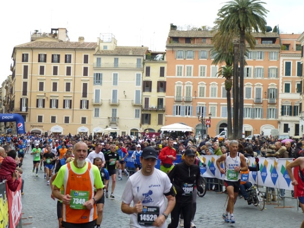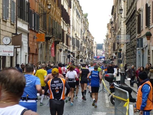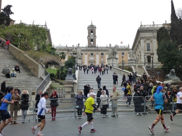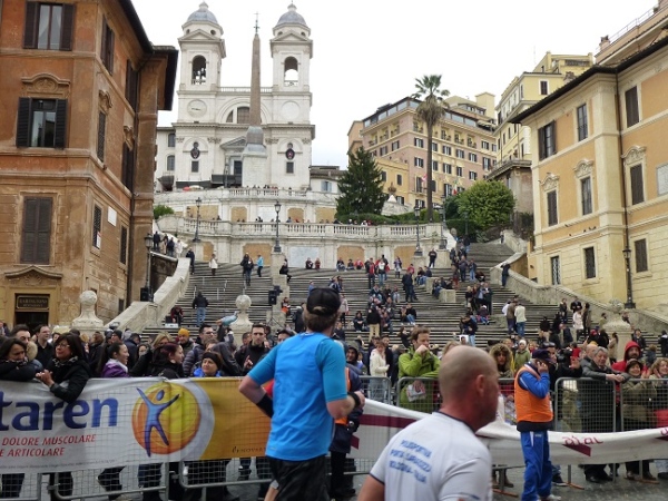 Mit der Piazza di Spagna passieren wir bei km 38 eine weitere Berühmtheit der Stadt. Die breite, steile Treppe hinauf zur Kirche Trinita die Monti ist einer jener Spots Roms, die eine geradezu magische Anziehungskraft auf Besucher aus aller Welt ausüben. Und auch die Maler haben sie zu Roms Romantikmotiv Nummer eins auserkoren. Einfach nur auf der Treppe zu sitzen und das Treiben zu beobachten gehört für viele wohl zum Pflichtprogramm, auch wenn der reale Romantikfaktor unter dem Massen-Sit-in ein wenig leidet. Heute ist es zum Sitzen wohl etwas zu kühl. Dafür stehen mehr Leute entlang der Strecke.