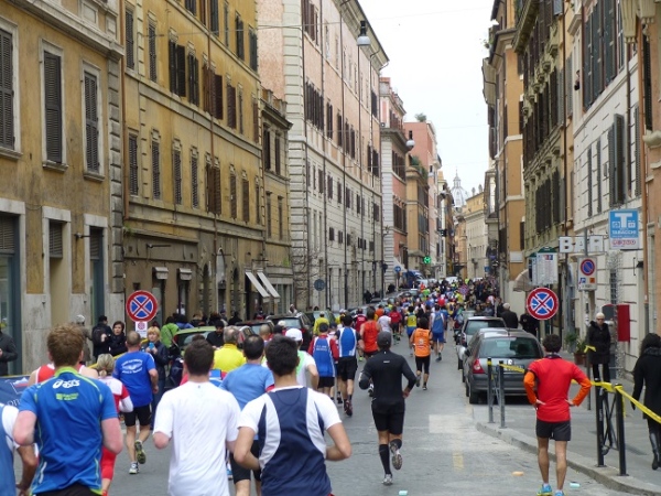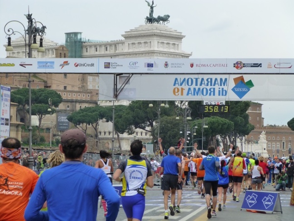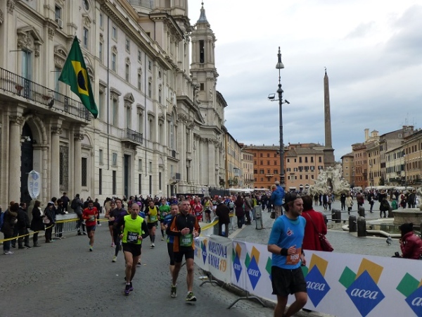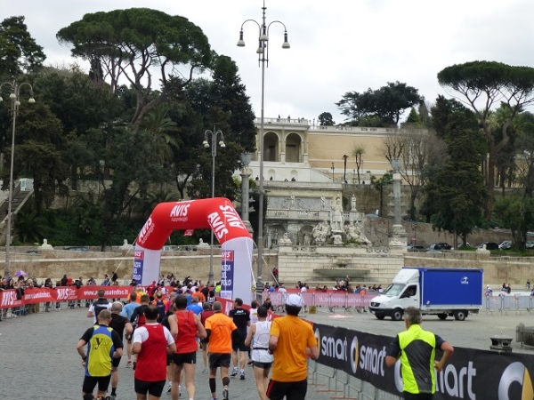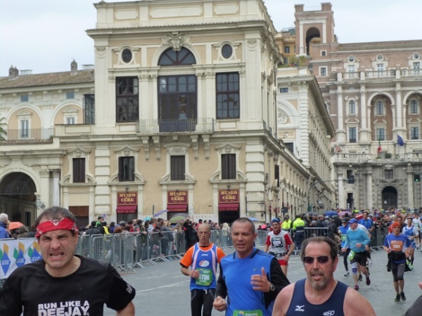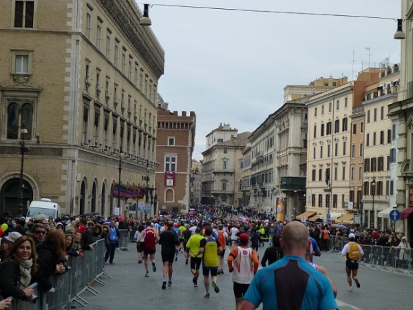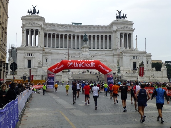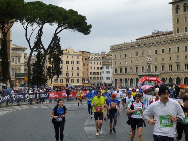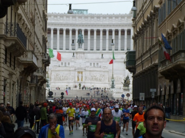 Noch ein kurzes Stück weit werden wir durch die schmalen Gassen gelotst. Dann öffnet sich mit einem Mal der Raum und wir laufen hinein in die Weite der Piazza Venezia mit dem alles überragenden Vittoriale. Wir wissen jetzt: Noch eine letzte 3 km-Schleife ist zu bewältigen, dann sind wir im Ziel.