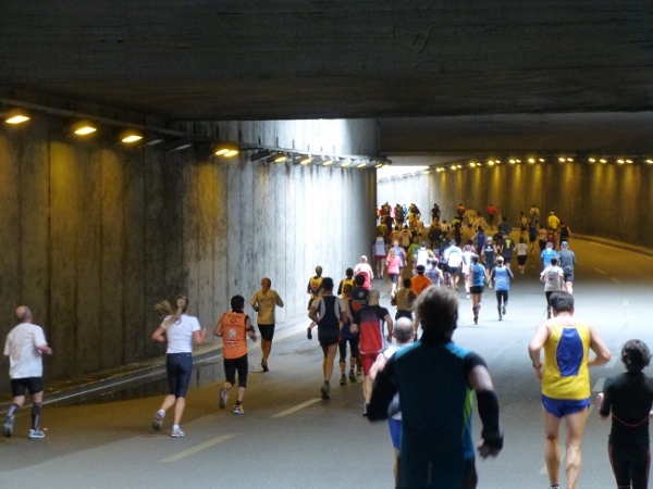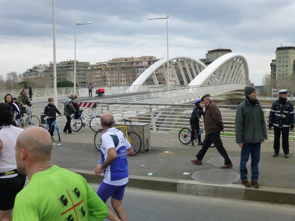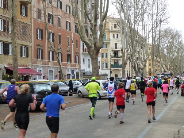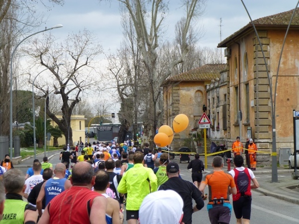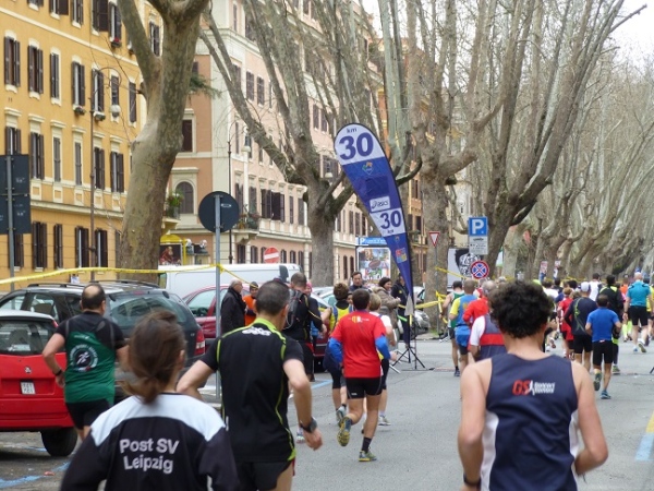 Unweit des Halbmarathonpunkts sind wir erneut am Tiber. Ein Ausflug in die nördlichen Stadtbezirke steht bevor. Es sind Kilometer, die mit Charme und Reiz eher geizen, aber Rom eben auch von einer anderen, normalen und weniger touristischen Seite zeigen. Optisch wie akustisch eher eintönig ist das Umfeld entlang des Flusses, so ganz anders als noch kurz vorher im Dunstkreis des Vatikan, wo uns inmitten der weltstädtischen Pracht immer wieder dichte Zuschauertrauben anfeuerten.