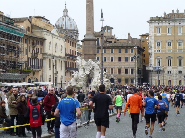 Im Laufschritt geht es zunächst über einen der bekanntesten Plätze Roms, die barocke Piazza Navona mit ihren vielen Straßenkünstlern auf und Straßencafes um den Platz. Die eigentümlich langgezogene ovale Form verdankt sie einem Stadion aus der römischen Kaiserzeit. Mächtig beherrscht Berninis ausladender Brunnen der vier Flüsse (Fontana dei Fiumi) ihren Mittelpunkt.
