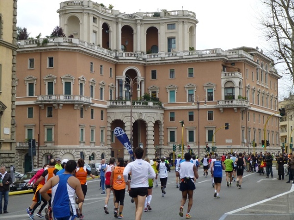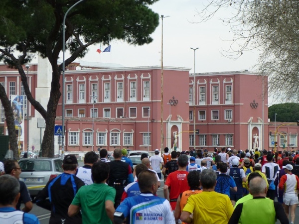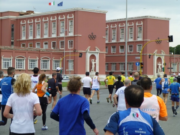 Bei km 23,5 erreichen wir das Foro Italico, das Gelände mit den Sportstätten der Olympischen Spiele von 1960. Ein barfuß laufender Äthiopier drückte den Spielen seinerzeit seinen Stempel auf: Abebe Bikila. Er siegte auf der Marathondistanz und holte damals als erster Schwarzafrikaner eine olympische Goldmedaille. Von dem weitläufigen Gelände bekommen wir allerdings nur einen kleinen Ausschnitt in Form eines statuengezierten, rosafarbenen Gebäudekomplexes mit, der daran erinnert, dass die Anfänge der Sportstätten schon in den 20er-Jahren des letzten Jahrhunderts liegen.