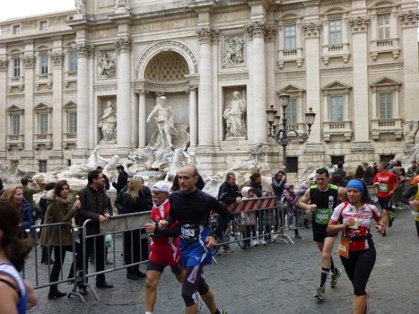 Ein paar Ecken weiter folgt schon der nächste Touristenmagnet: die Fontana di Trevi. Einer überladenen Operbühne gleich offenbart sich uns nur für ein paar Sekunden die barocke Brunnenanlage. Mit Anita Ekberg in Fellinis „La dolce vita“, üppig blond im Wasser räkelnd, hat es der Brunnen selbst zu filmischer Berühmtheit gebracht. Und umgekehrt ist es wohl genauso. Im Hier und Jetzt verstopfen allerdings menschliche Heerscharen die Kulisse, wobei die Läufer den Vorteil einer für sie reservierten Trasse haben.