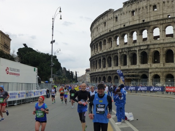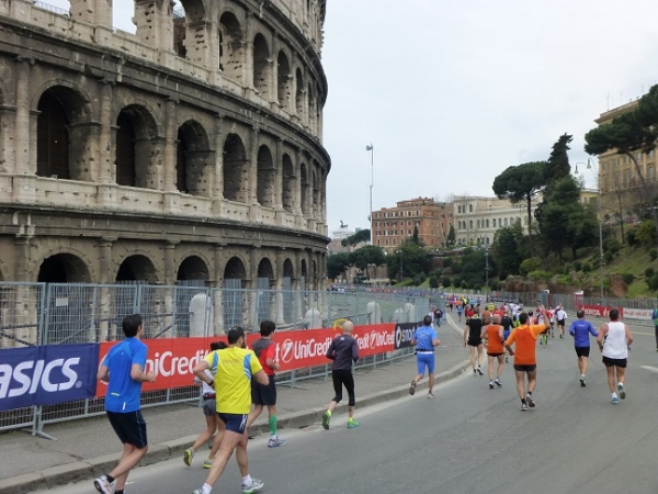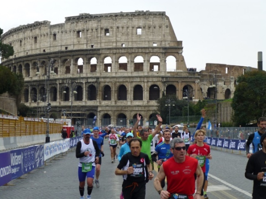 Und dann ragen Sie unmittelbar vor uns empor, bis zu 54 Meter hoch: die monumentalen Überreste des Kolosseums, des größten Amphitheaters der Antike, das wohl eindrucksvollste Gemäuer, das aus der römischen Antike durch alle Wirren der Zeit bis heute hinüber gerettet wurde. Zu fast drei Vierteln umrunden wir jene Arena, in der sich im Altertum bis zu 50.000 Zuschauer an blutigem Gladiatoren-Spektakel ergötzten. Im Gegensatz dazu geht es jetzt doch sehr viel gesitteter zu. Und wer es bis hierher geschafft hat, der weiß, dass er den inneren Gladiatorenkampf mit dem „Mann mit dem Hammer“ als Sieger verlässt, auch wenn nicht jedes Gesicht mehr in der Lage ist, diesen Triumph auszudrücken. Vor allem die letzte fiese Steigung, die der Weg um das Kolosseum für uns bereit hält, fordert nochmals vollen Kampfesgeist. Aber dann ist es geschafft.