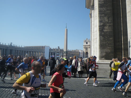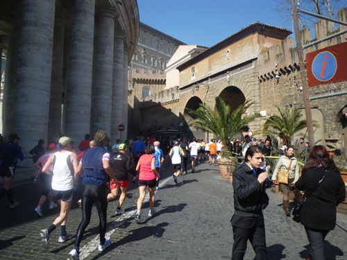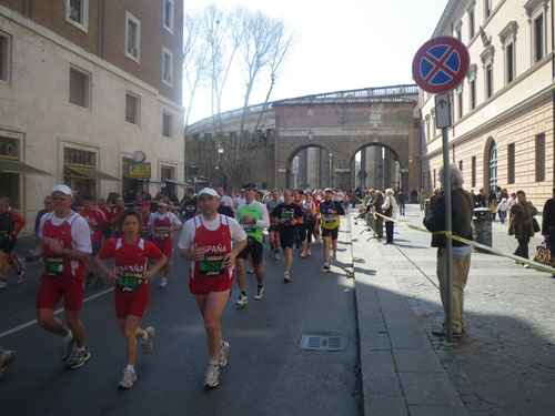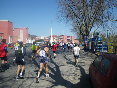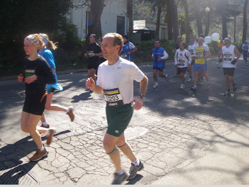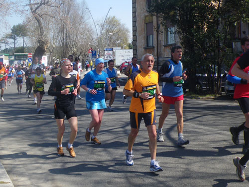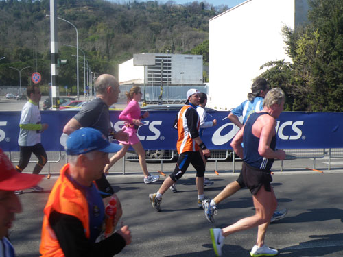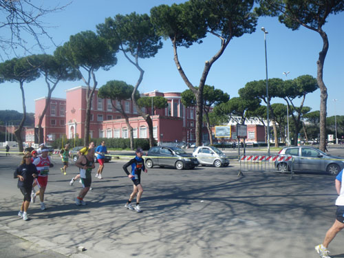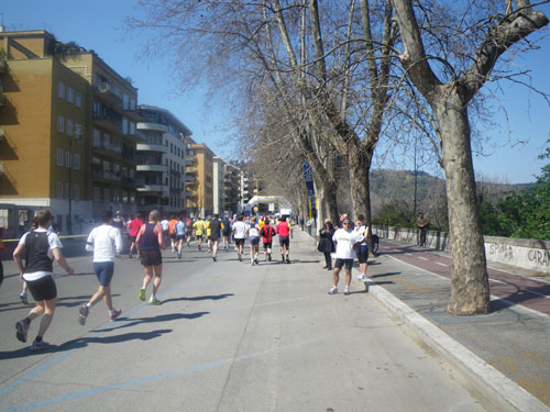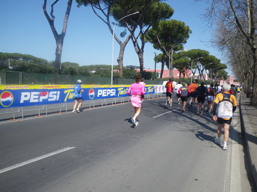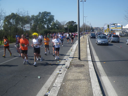 Die nächsten Kilometer führen durch römische Wohngebiete und sind recht unspektakulär, aber eine kleinere Aufheiterung gibt’s für mich dann doch noch. Für uns ist die rechte Fahrbahnseite einer Straße abgesperrt, auf der gegenüberliegenden Seite rollt uns normal der Autoverkehr entgegen. Der Verkehr in unsere Laufrichtung ist somit für ein paar Stunden blockiert. Einen Radler schert das überhaupt nicht, er widersetzt sich einfach den Absperrungen und strampelt den Autos auf ihrer Fahrspur entgegen. Da hat er aber die Rechnung nicht mit der Polizistin gemacht, die diesen Abschnitt hier regelt. Sie pfeift ihn derart zusammen, dass er sein Unterfangen schnell wieder bleiben lässt. Heute haben nur wir Marathonis einen Freifahrtschein.