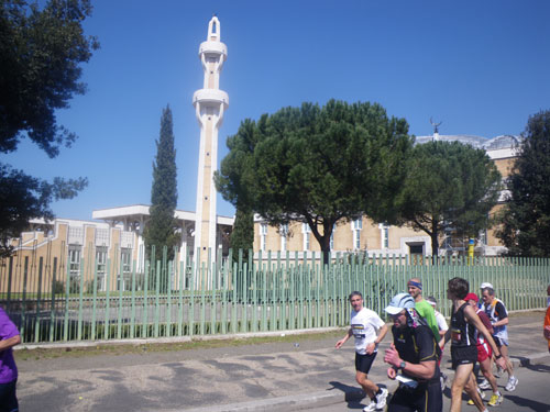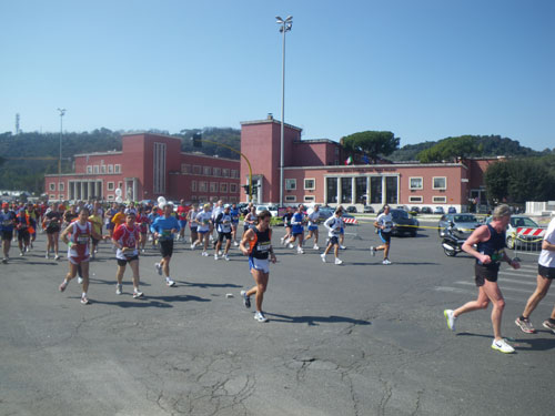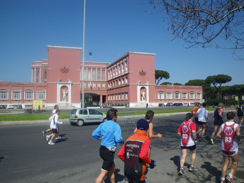 Nach 25 km passieren wir das über 70 Jahre alte Foro Italico, ein Relikt aus der faschistischen Zeit. Der Komplex besteht aus mehreren Sportanlagen und weiteren monumentalen Gebäuden. Das Gelände dient bis heute Sport und Politik, es beherbergt das Olympiastadion, ein Schwimmstadion und Tennisanlagen. Die Gebäude sind alle in auffälligen Rot gehalten.