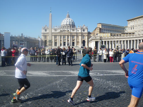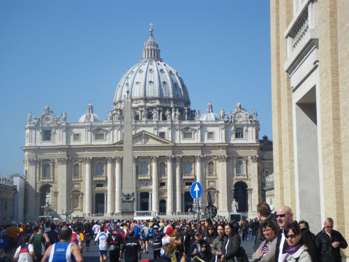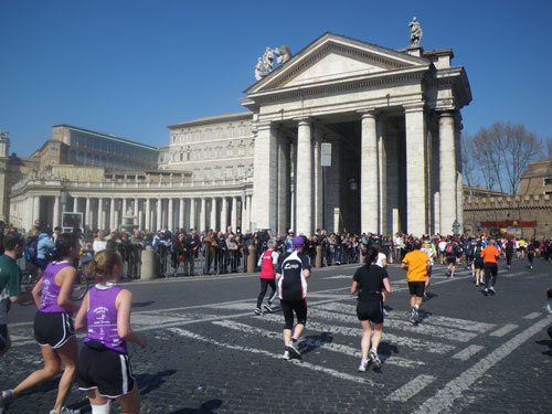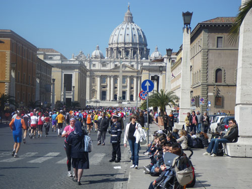 Bei km 15 steht auf der gegenüberliegenden Uferseite das Castel Sant' Angelo, oder zu deutsch, die Engelsburg. Das ursprüngliche Mausoleum von Kaiser Hadrian war fast zweitausend Jahre Festung und Schloss. Heute ist sie ein Museum. Über die Ponte Cavour nähern wir uns dem Vatikan. Um ein paar Ecken führt der Weg auf die Via della Conciliazione die schnurstracks auf den Petersdom zuführt. Wir laufen direkt auf den Petersplatz zu und stören gerade eine Messe, die dort stattfindet. In San Pietro rein dürfen wir aber nicht, selbst wenn wir wollten, kurze Hosen sind nämlich verboten.