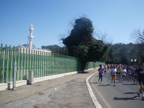 Den nördlichsten Punkt des Kurses erreicht man etwa bei km 28. Erst geht es noch an der vierspurigen Via del Foro Italico entlang. Für uns hat man zwei Fahrspuren gesperrt, darum müssen sich die Autos jetzt eine Fahrbahnseite teilen. Ob die heißblütigen Italiener wohl alle Verständnis dafür aufbringen und uns nicht verfluchen? Nach ein oder zwei Kilometern geht’s aber endlich wieder runter, verbunden mit einem Richtungswechsel nach Süden. Jetzt wird es auch richtig angenehm warm, weil wir den Wind wieder im Rücken haben.