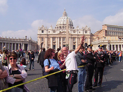 Über die Via della Conciliazione, die Straße der Versöhnung, laufen wir direkt dem zentralen Platz für Katholiken aus aller Welt, dem Petersplatz entgegen. Beeindruckend sind die Dimensionen des Platzes und der dahinter frontal aufragenden Kuppel der Peterskirche. Eine Militärkapelle intoniert schmissig, gekonnt und melodisch passend die "Washington Post".
