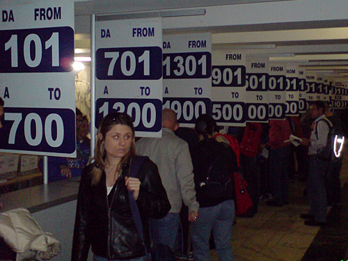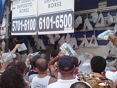 Wie in den letzten Jahren führt der erste Weg der Läufer am Wettkampftag hin zu den unterhalb des Palatin aufgereihten und für die Gepäckabgabe bereitgestellten Fahrzeugen. Dieses Jahr hat man an Stelle der Linienbusse große LKW zur Aufbewahrung der Kleidersäcke bereit gestellt. Obwohl auf jedem LKW 800 Kleiderbeutel abgelegt werden müssen, geht die Aktion zügig über die Bühne. Beim Abholen viel später sah es leider anders aus. Ewige lange Wartezeiten waren zu ertragen, einzelne Teilnehmerinnen hievten sich sogar entnervt auf die Ladefläche der LKW und holten ihre Kleiderbeutel selbst hinunter.