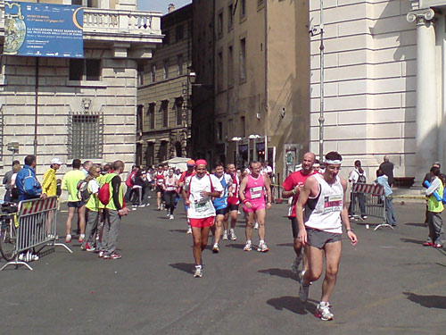 Kurz darauf biegen wir von der alten Streckenführung ab und laufen hinab in Richtung der Porta San Paolo und zu der Basilica di San Paolo. Gut, dass man sich zu dieser Änderung entschlossen hat. Letztes Jahr fand sich hier auf den letzten Kilometer des Marathons noch eine eher triste Wendepunktstrecke mit reichlich Kopfsteinpflaster.