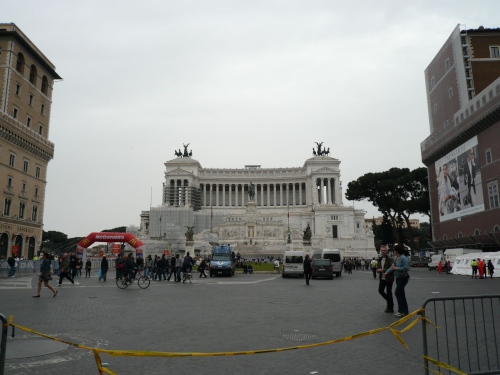 Nun erreichen wir über wildes Pflaster die Piazza Venezia zum dritten und letzten Mal. Wieder haben wir den herrlichen Blick auf das schneeweiße Monumento Nationale a Vittorio Emanuele II. Es geht über den Monte Kapitolino vorbei am Circo Massimo. An der Piazzo Porta Capena beginnen die letzten 2 km. Das Kopfsteinpflaster hat schon die letzten Muskelfasern zermürbt und wir sehnen uns dem Ziel entgegen. Wir haben das Colloseum im Blick und kurz davor ist der Ultimo Kilometro angezeigt. Jetzt geht es über einen Hügel direkt am Colloseum entlang. Wir umrunden es fast und erreichen zwischen Colloseo und Fono Romano auf der Via die Fori Imperiali erschöpft aber überglücklich das Ziel.