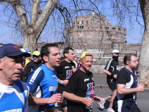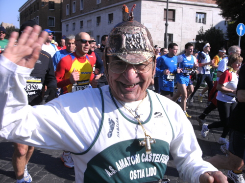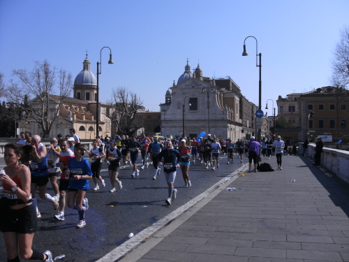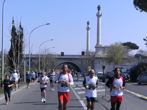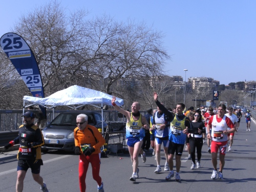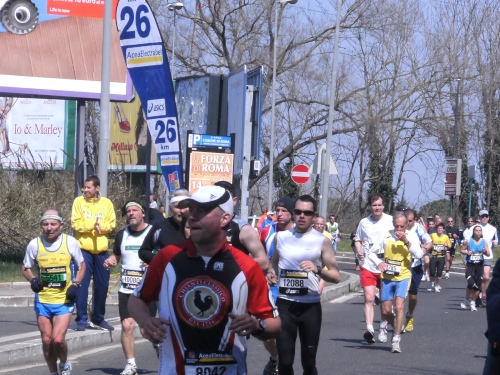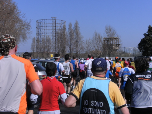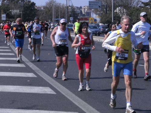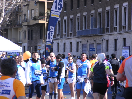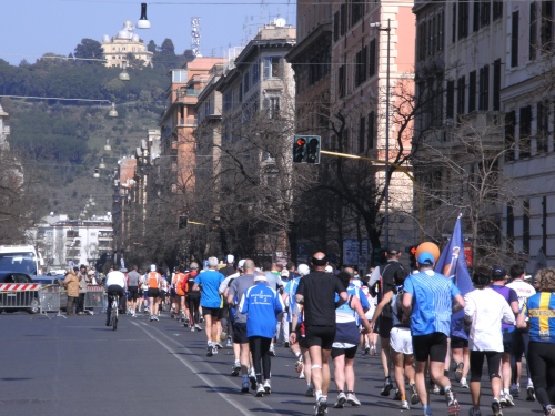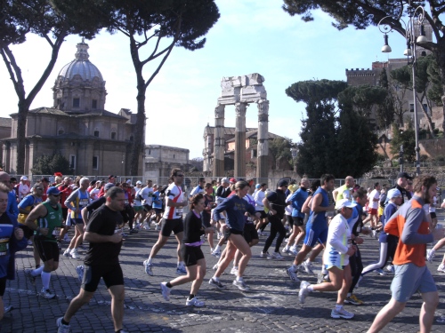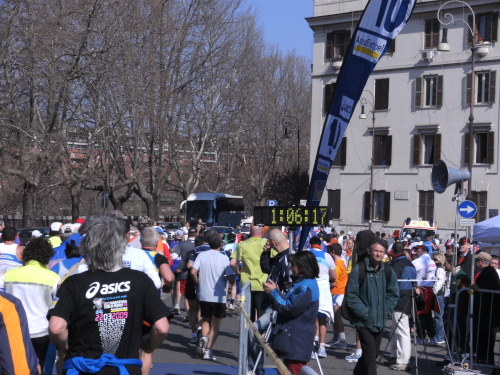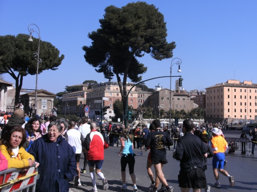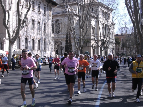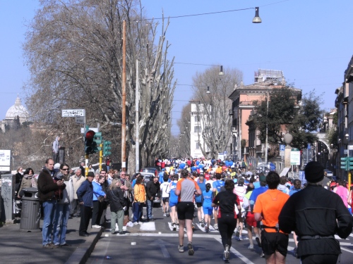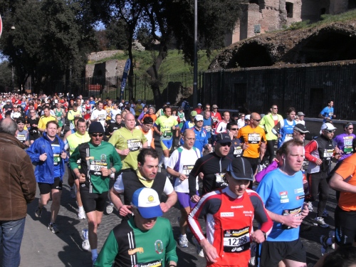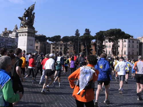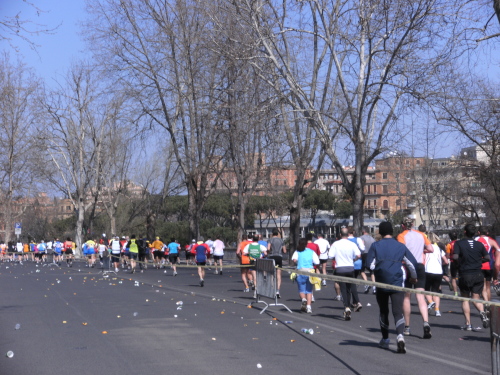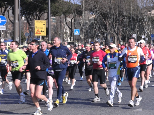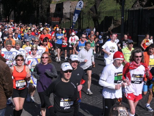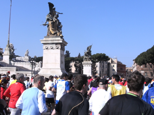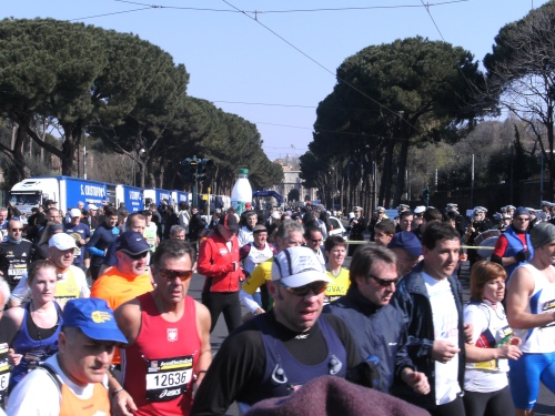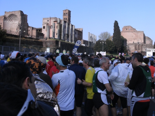 Über 11.000 Starter wollten mir uns den Lauf genießen. Das war nach über 12.000 Teilnehmern 2007 die zweitgrößte Beteiligung am Maratona di Roma. Alle freuten sich über das sonnige Wetter. Es war zwar am Morgen noch frisch und auch windig, aber die Sonne lachte vom strahlend blauen Himmel und versprach einen schönen Tag. Die Kälte der letzten Tage war gemildert, es herrschten zum Laufen angenehme Temperaturen. Gegen die Kühle des Morgens hatten wir ausgesonderte Kleidung mit, der wir uns eine Minute vor dem Start entledigten und an den Straßenrand warfen – wie viele andere Läufe auch.