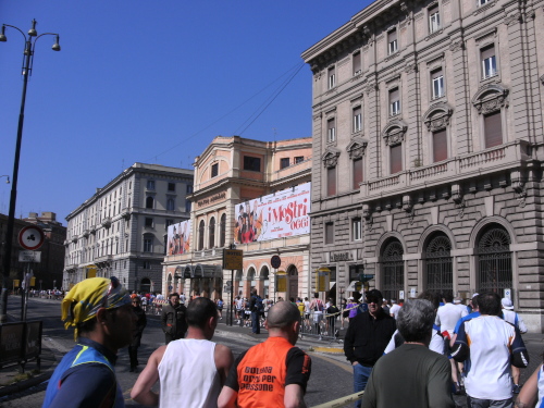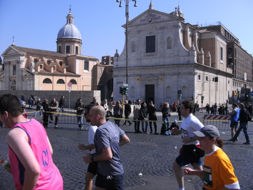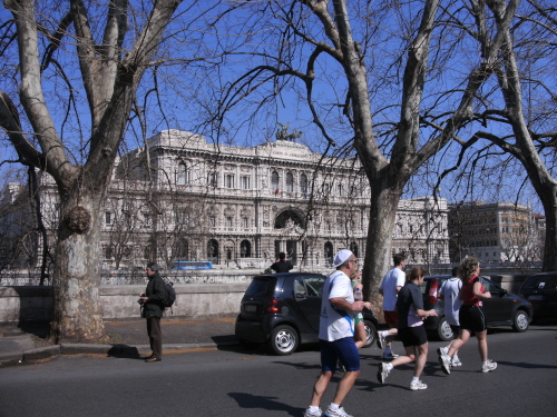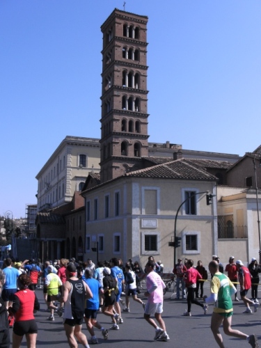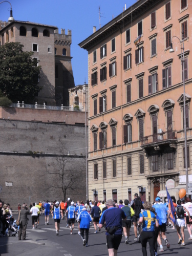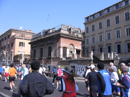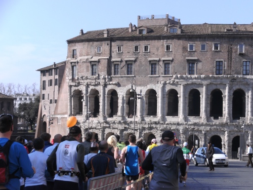 An der Piazza Venezia steigt der Kurs in einer Kurve nach links etwas an, macht nix, zum Teatro di Marcello geht es wieder hinunter. Diese Passage weist wie einige andere auch Kopfsteinpflaster auf. Dieses ist aber gut zu laufen und bereitet keine Probleme.