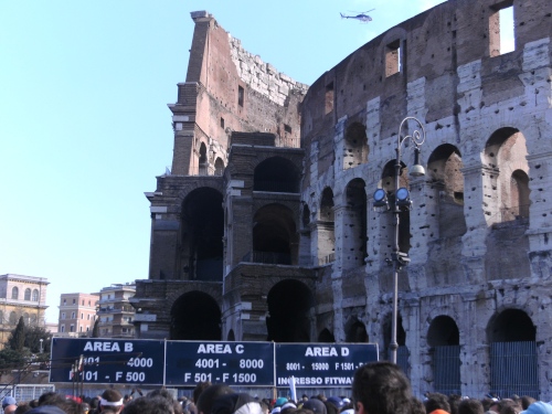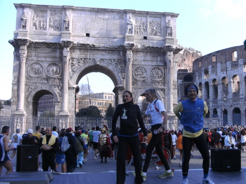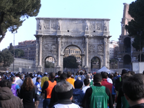 Die heutigen Massen haben friedliche Absichten. Sie folgen allenfalls den auch in Rom vorhandenen Zug- und Bremsläufern mit ihren bunten Luftballons, aber keinem Kaiser mehr. Wir mussten uns den Weg bis zum letzten LKW bahnen. Hier erst war der Bereich für Jens’ Startnummer. Wir gingen durch die Massen zurück und passieren unmittelbar am mächtigen Konstantinbogen die Kontrolle am Eingang zu unserem Startkorridor.