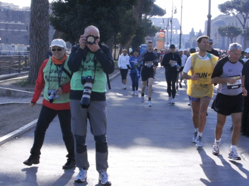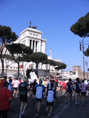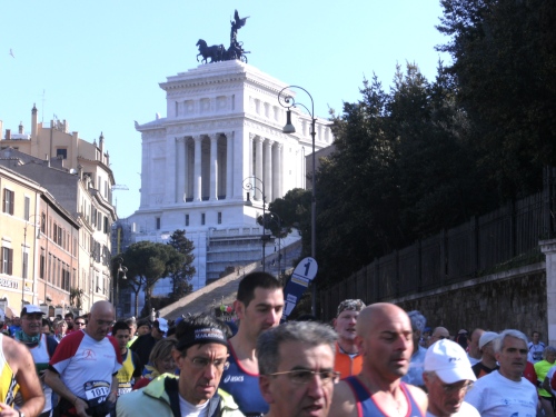 Schon die ersten Meter auf der Via dei Fori Imperiali zwischen dem Forum Romanum und dem Trajansforum mit Blick auf Piazza Venezia, Trajansäule und Monumento Nationale sind atemberaubend. Ich bleibe auf Höhe der Trajanssäule stehen um zu fotografieren und stehe Margot und Klaus Duwe gegenüber. Wir fotografieren uns rasch gegenseitig – dann laufe ich weiter und versuche an Jens dran zu bleiben. Immer wieder bleibe ich für Fotos stehen. Noch nie habe ich bei einem Lauf so viele Fotos gemacht wie in Rom. Ein Motiv folgt dem anderen.