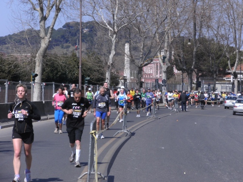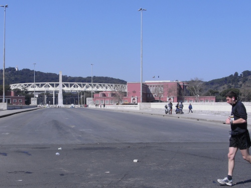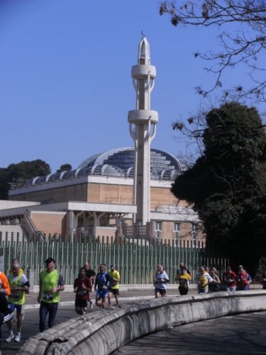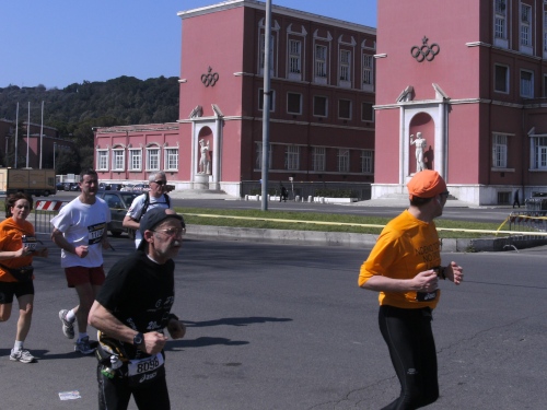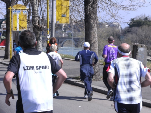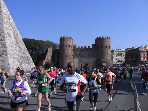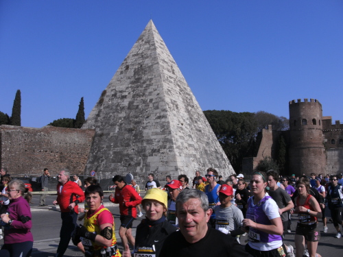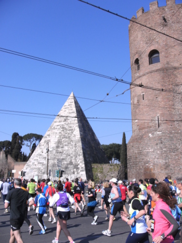 Es folgt mit der Pyramide des Ciao Cestio der nächste Hingucker auf der Strecke, bevor es einige Kilometer Richtung Süden durch Wohn- und Gewerbegebiete geht. Wir laufen durch Ostiense und queren zum ersten Mal den Tiber über die Ponte G. Marconi. Erstmals folgt der Kurs dem Tiber, biegt ab Richtung Bahnhof Trastevere und führt erneut über die Ponte Testaccio über den Fluss. Hier ist Kilometer 10 erreicht.