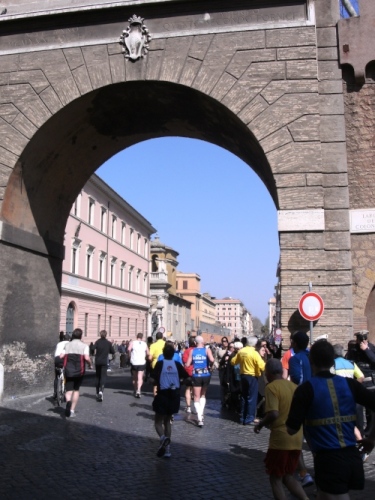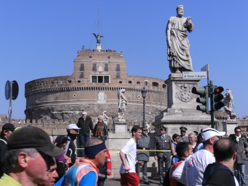Auf abgesperrter Straße bleiben wir am Flussufer und sehen bereits die mächtige Kuppel des Petersdoms. Linker Hand grüßt das Castel Sant’ Angelo mit der Ponte S. Angelo und ihren zehn Engelsstatuen. Über die Ponte Cavour laufen wir erneut über den Tiber. Da der Fluss jedoch recht tief eingeschnitten durch Rom führt sind mit der Brücke keine Höhenmeter verbunden. Weiter geht es über die Piazza Cavour an der Rückseite der mächtigen Engelsburg vorbei. Diese ist über den Passetto, einer Mauer mit einem verdeckten Gang, mit dem Vatikan verbunden. Der Passetto diente den Päpsten zu früheren Zeiten als Fluchtweg in das Castel Sant’ Angelo.