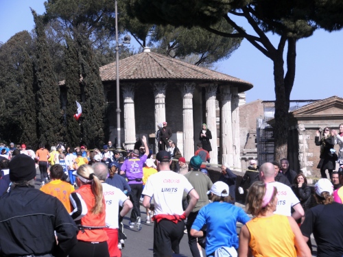 Unterwegs hören wir immer wieder unterschiedliche Sprachen. Der Lauf in Rom ist international besetzt. Nach dem Teatro di Marcello geht es an der Piazza della Bocca della Verita wenige Meter aufwärts. An einer Wand der Vorhalle der Kirche an der Südseite des Platzes befindet der offene Mund der Bocca del Verita. Die antike Flussgottheit soll der Legende nach jeden Schwindler entlarven. Ich riskiere es lieber nicht die Hand in den offenen Mund zu stecken und laufe weiter vorbei am Circus Maximus. Auf der 550m langen Rennbahn konnten einst 150.000 Zuschauer die Wagenrennen der Antike verfolgen. Die Marathonis werden von deutlich weniger Zuschauern angefeuert.