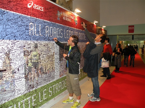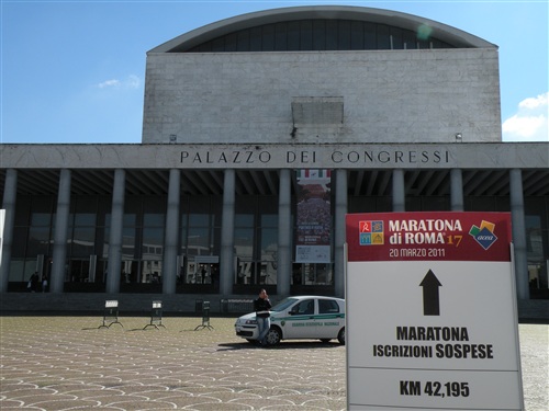 Mit diesem guten Vorsatz versehen, wagen wir uns am Freitag in der Frühe auf die Marathonmesse, die im Palazzo dei Congressi  stattfindet. Dieser befindet sich leider nicht in der Innenstadt, ist aber mit der Linie B der Metro in südlicher Richtung gut erreichbar (Richtung Laurentina, an der vorletzten Station „EUR Fermi“ aussteigen) und von Donnerstag bis Samstag jeweils zwischen 10 und 20 Uhr geöffnet. Nette Hilfskräfte weisen den Weg, sogar mit einem Kartenausschnitt.