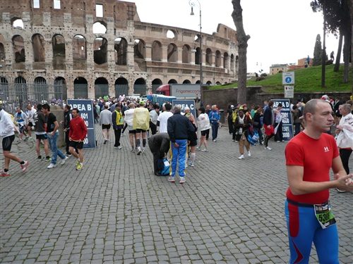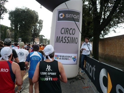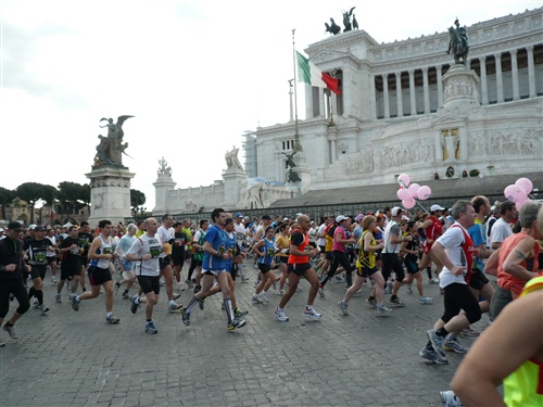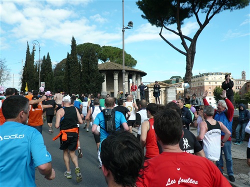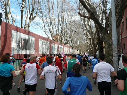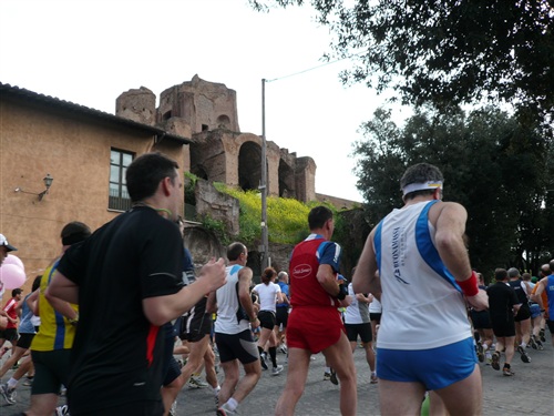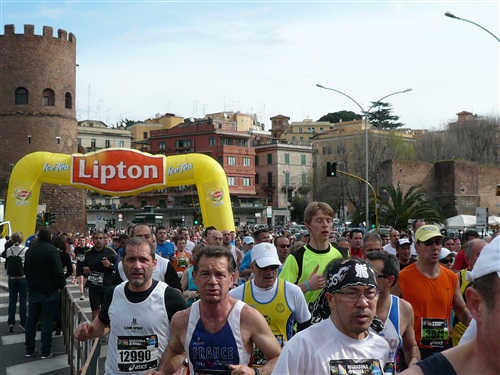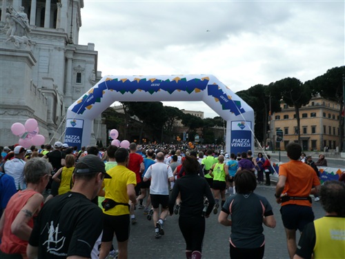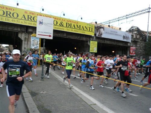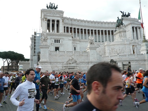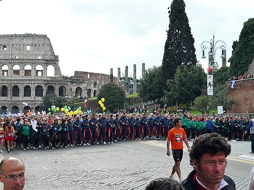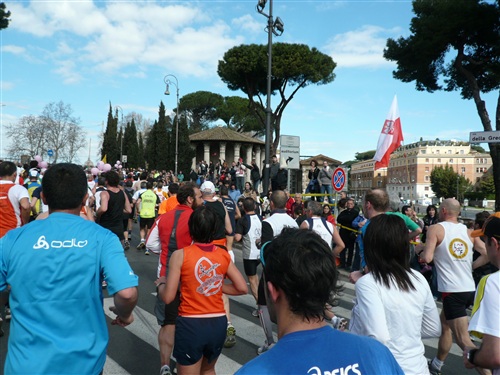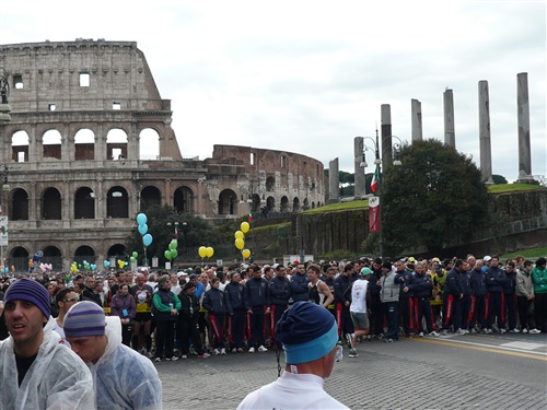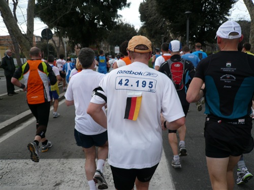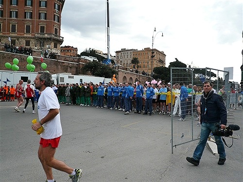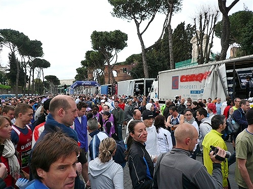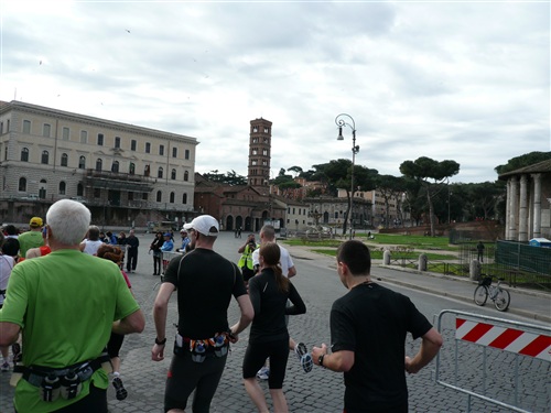 Die Nationalhymne wird gespielt und vier Minuten verspätet geht es los. Ich drücke mich an den rechten Rand, um kein Hindernis für die Angeber hinter mir darzustellen. Noch ist die Stimmung gelöst und die ersten Meter auf der Via dei Fori Imperali werden genutzt, überschüssiges Adrenalin abzubauen. Der Vorwärtsdrang wird zunächst durch die Enge der Straßen gehemmt, ein guter Sechserschnitt ist die logische Folge.