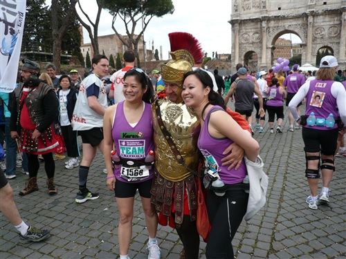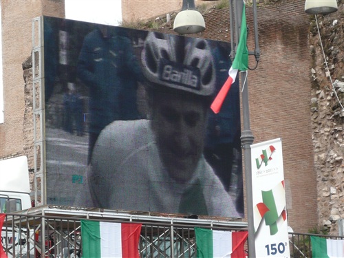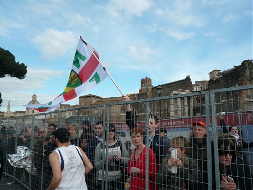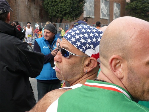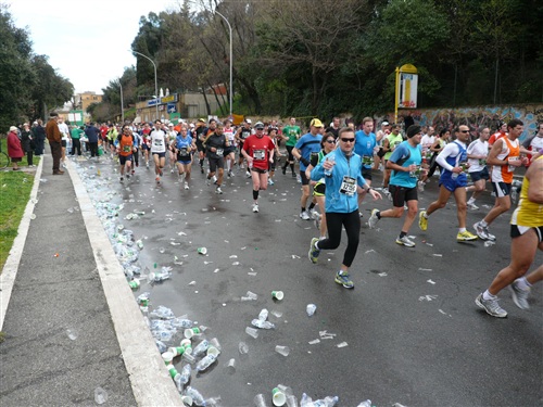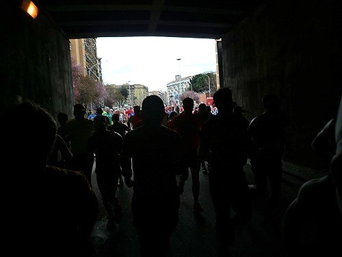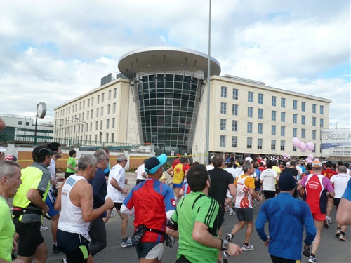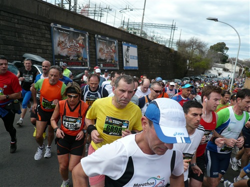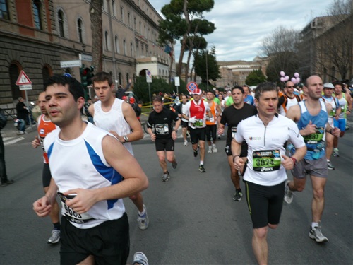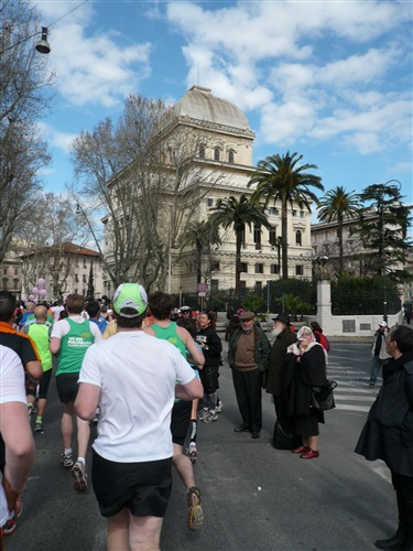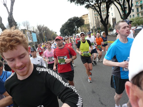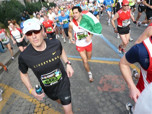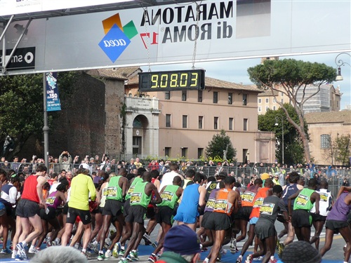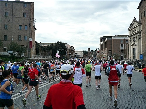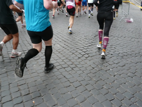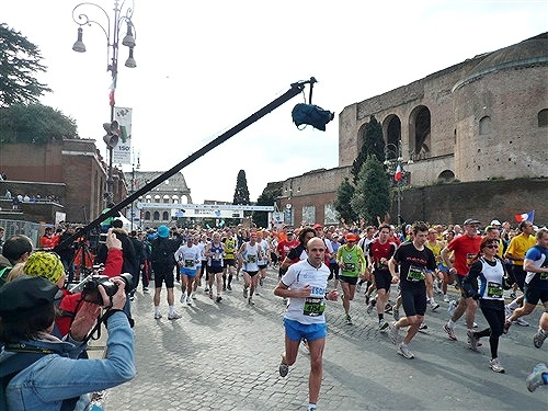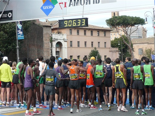 Die Nationalhymne wird gespielt und vier Minuten verspätet geht es los. Ich drücke mich an den rechten Rand, um kein Hindernis für die Angeber hinter mir darzustellen. Noch ist die Stimmung gelöst und die ersten Meter auf der Via dei Fori Imperali werden genutzt, überschüssiges Adrenalin abzubauen. Der Vorwärtsdrang wird zunächst durch die Enge der Straßen gehemmt, ein guter Sechserschnitt ist die logische Folge.