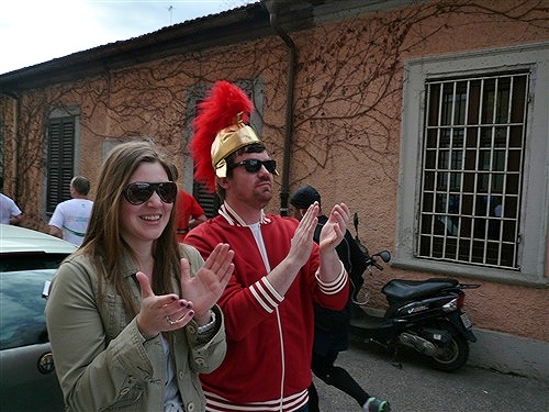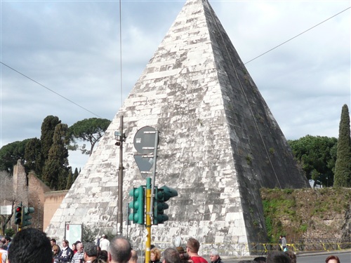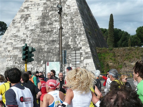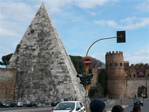 Was schon der alte Horaz wußte, setzen wir in die Tat um. Vier Mal führt uns der Weg nun nordwärts bis kurz nach der Halbzeit über den Fluss Tiber (25 Brücken führen in Rom darüber), auf dem Romulus, der spätere angebliche Stadtgründer und sein Bruder Remus in Weidenkörben ausgesetzt worden sein sollen. Bei km 9 sticht die Pyramide des Caius Cestius (Praetor und Volkstribun) ins Auge, die mit der Porta San Paolo ein beeindruckendes Ensemble bildet.