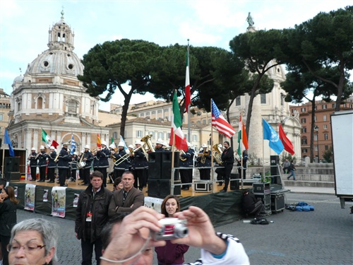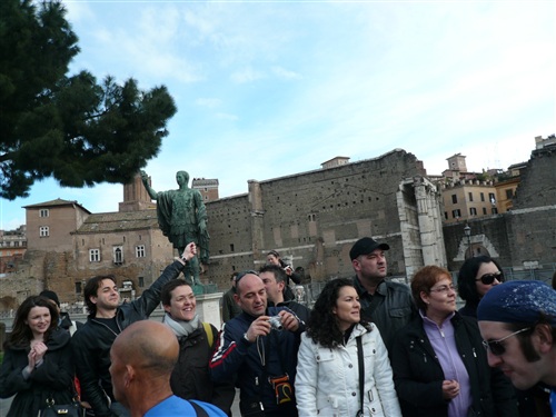 ... zahlreicher Zuschauer umrunden wir zunächst das Kapitol (von „Caput Oli“ – Schädel des Olus, eines hier einstmals begrabenen Etruskerkönigs) auf dem kleinsten der berühmten sieben römischen Hügeln. Wie sagt ein US-amerikanischer Marathonführer so schön: „Everyone romantically speaks of Rome’s original seven hills, and the course finds at least every one of them“ (in etwa: Jeder spricht verklärt von den sieben Hügeln Roms und die Strecke streift letztlich jeden von ihnen). Traumhaft ist der von Michelangelo geplante Kapitolsplatz. Natürlich wird auch die monumentale (Sieges-) Trajanssäule abgelichtet. Auf dem spiralförmig aufsteigenden Fries, der mit 23 Windungen eine Gesamtlänge von 200 Metern erreicht, ließ Kaiser (übrigens von „Cäsar“ entwickelt) Trajan Szenen aus seinen erfolgreichen Kriegen gegen die Daker in den Jahren 101/102 und 105/106 darstellen. Insgesamt sind 2500 menschliche Figuren von etwa 60–75 Zentimeter Höhe abgebildet. Den Kaiser selbst kann man rund sechzigmal identifizieren.