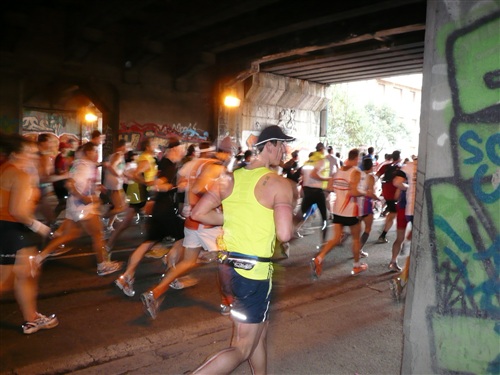 Beim Betrachten so manchen Gesichts könnte man fast meinen, ein Zug Gladiatoren sei erneut auf dem Weg zum Kampf auf Leben und Tod und entböte den damaligen Gruß vor Kampfbeginn. Nun ja, für so manchen wird es sicherlich einen Kampf auf Biegen und Brechen geben, zumindest anstrengend wird’s für alle werden. Nach längerem Überlegen stelle ich mich dann wirklich in den Startblock A, die Versuchung ist einfach zu groß. Mann, ist hier Platz! Die lahmen Enten ab 3 Std. Laufzeit stehen schon wie die Heringe und wir Helden haben sogar Platz zum Einlaufen (worauf ich sicherheitshalber verzichte…). Dann kommen die Schwatten – eine Augenweide! Ich bin wirklich beeindruckt.